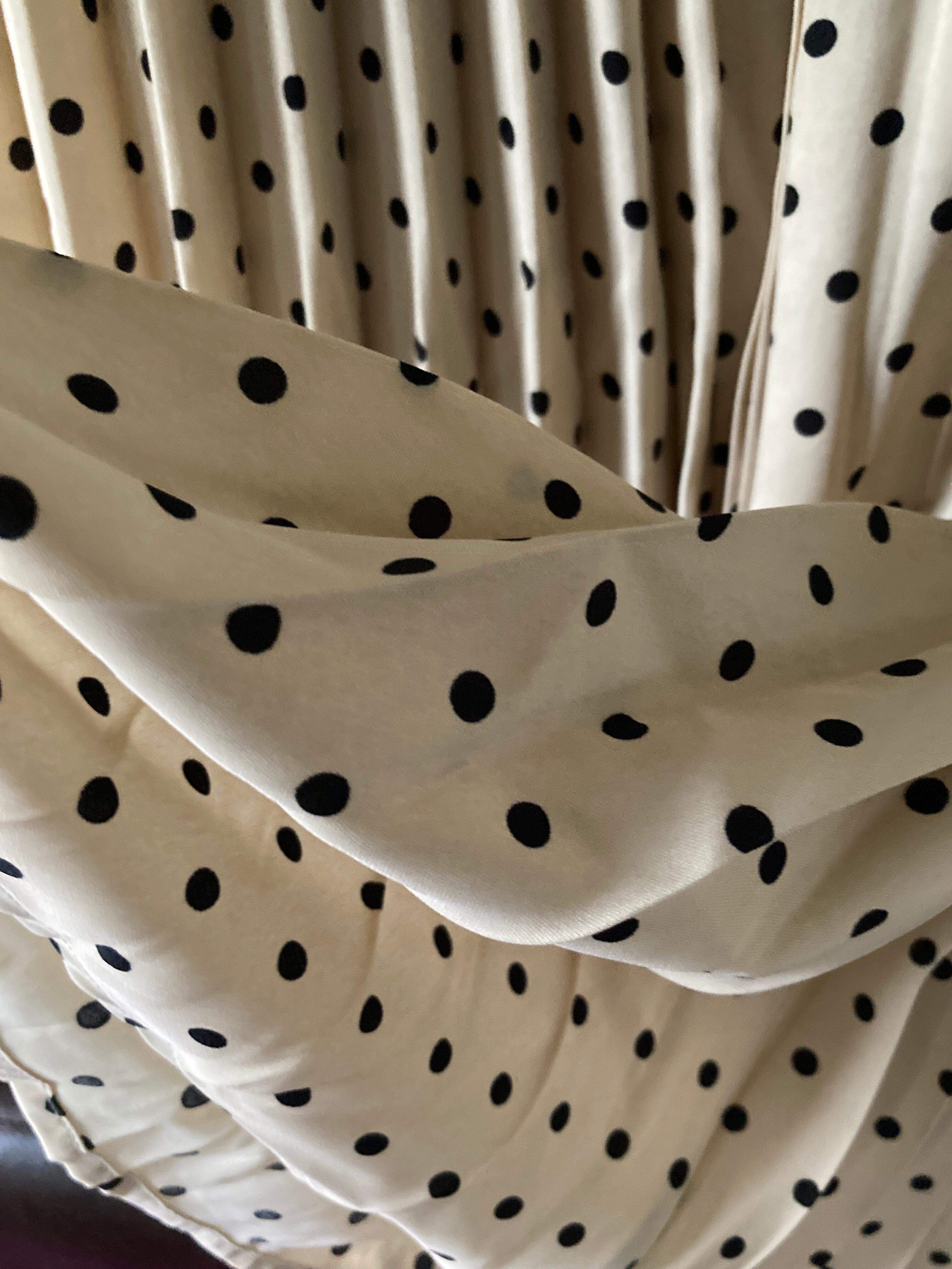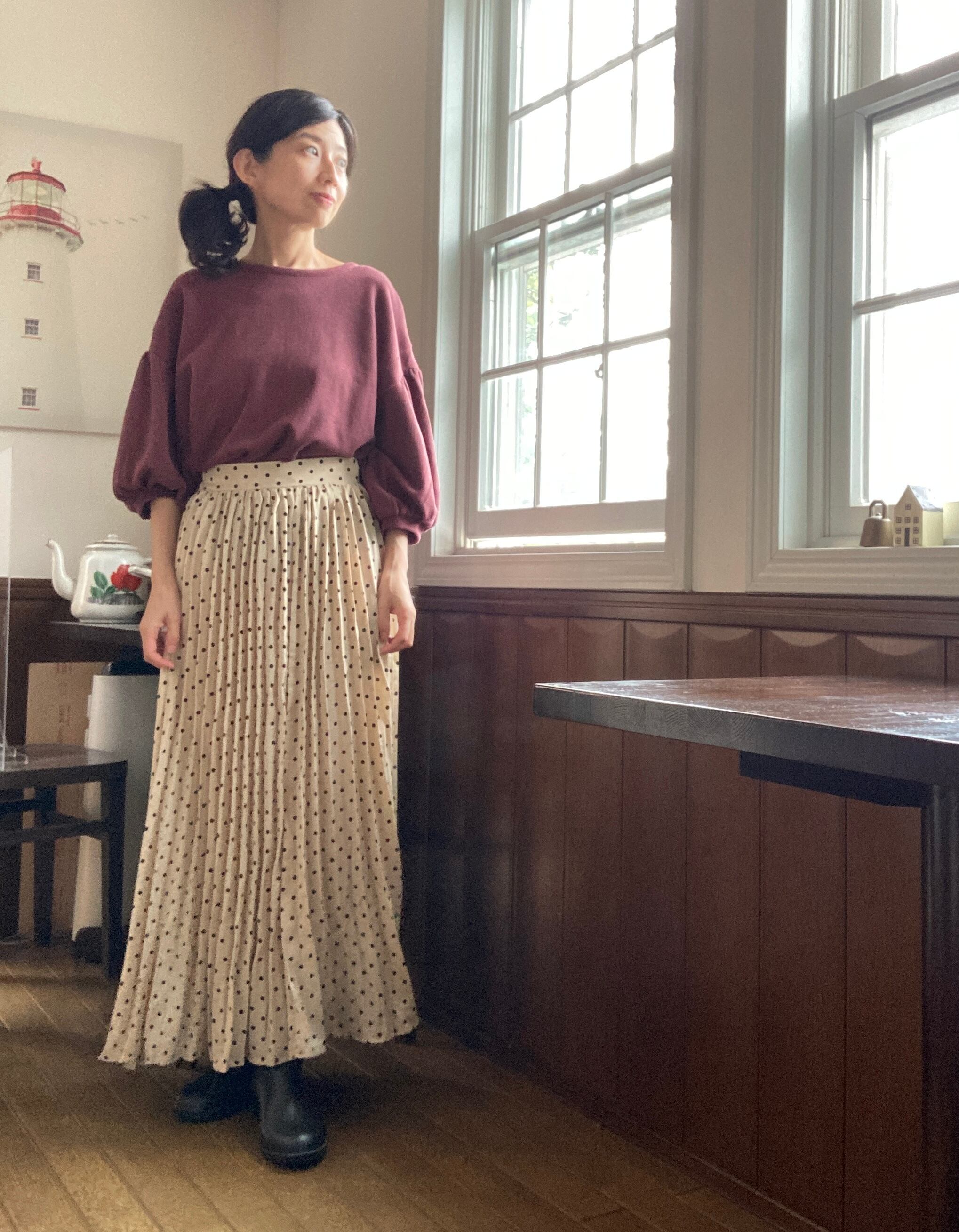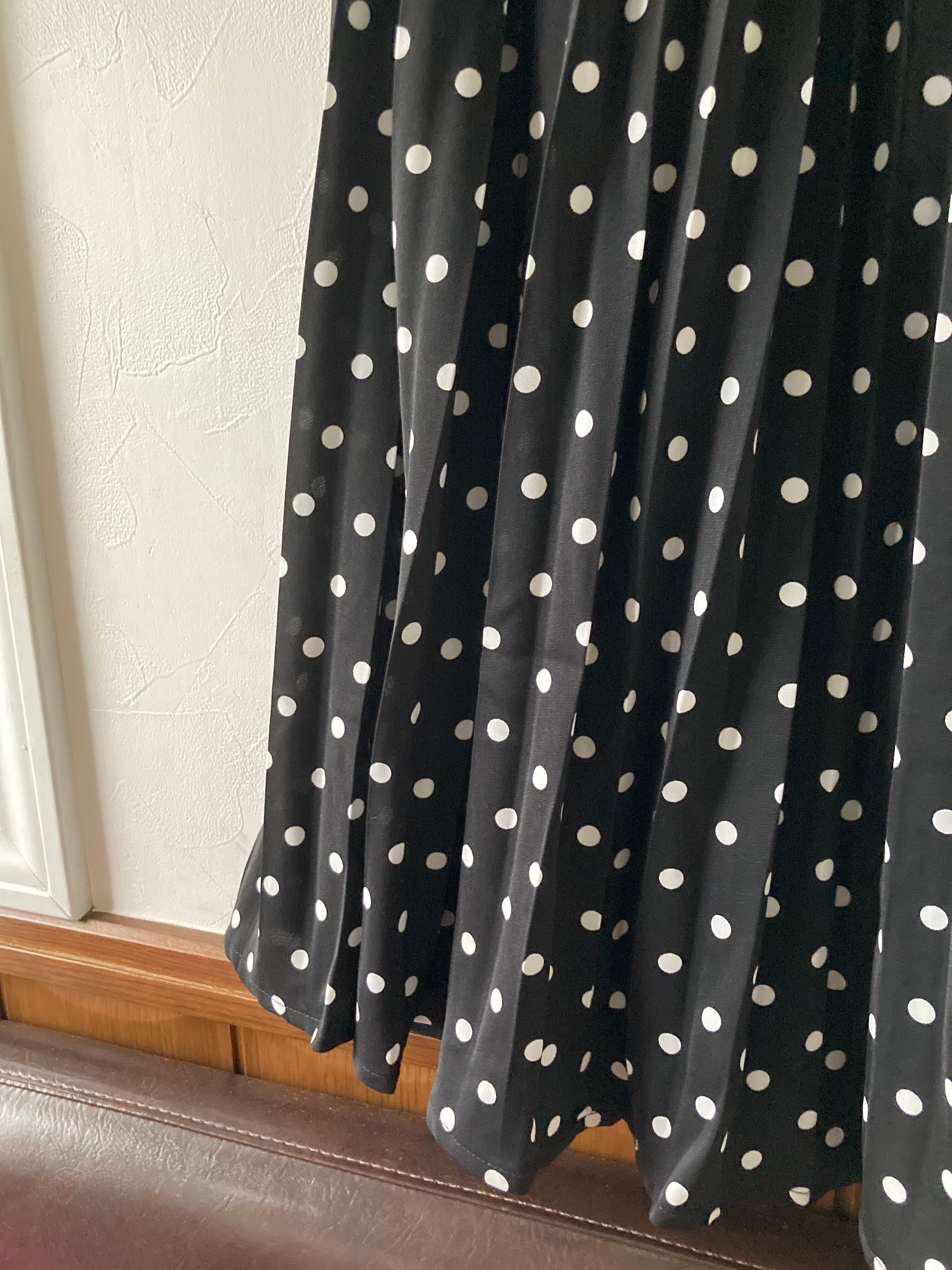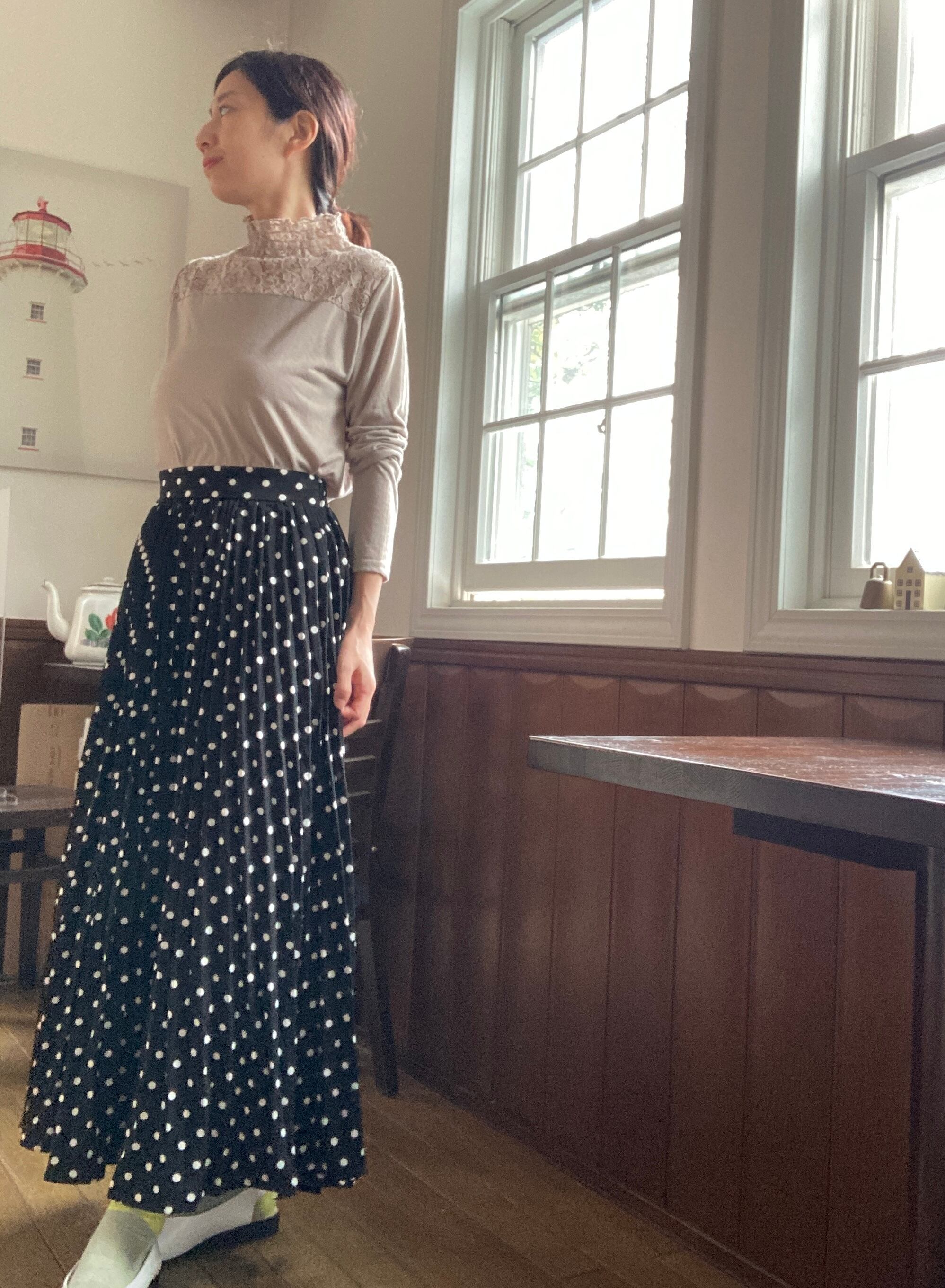 モノトーンのドット模様とプリーツが、ノスタルジックな雰囲気たっぷりのロングスカート。てろんとした落ち感が綺麗でエレガントな印象に。合わせるトップス次第でオールシーズン活躍してくれるアイテムです。カジュアルにもフレンチテイストにも。