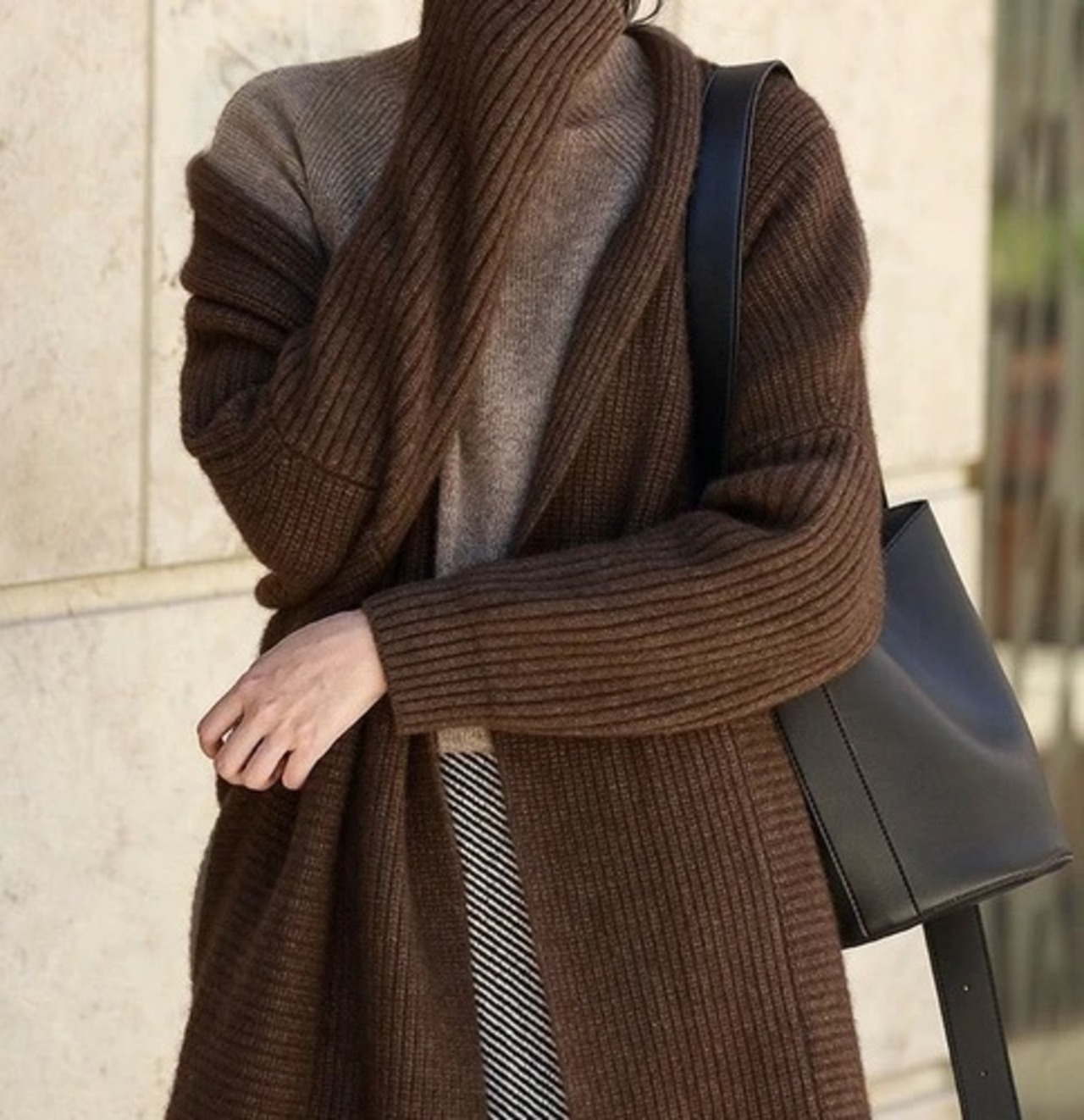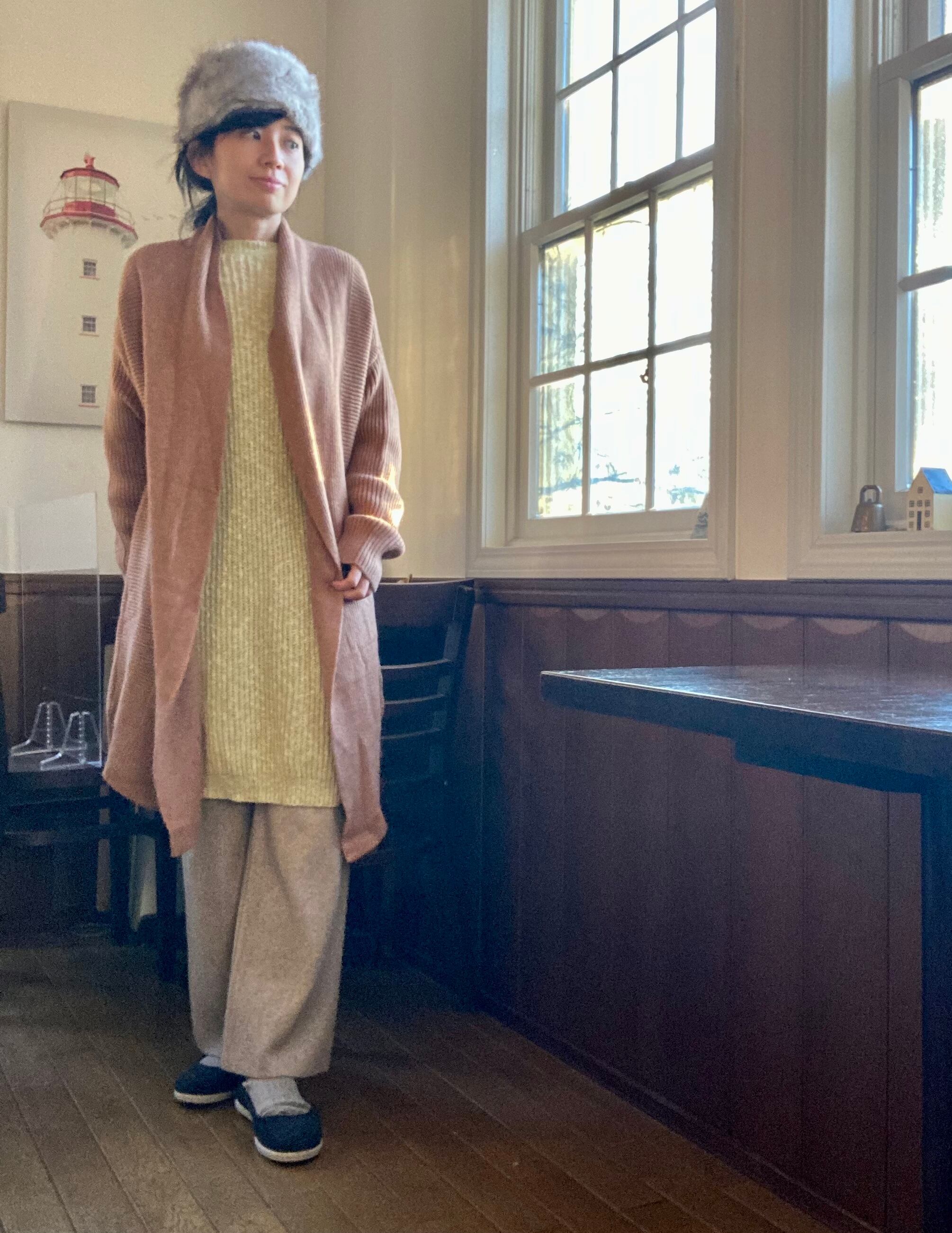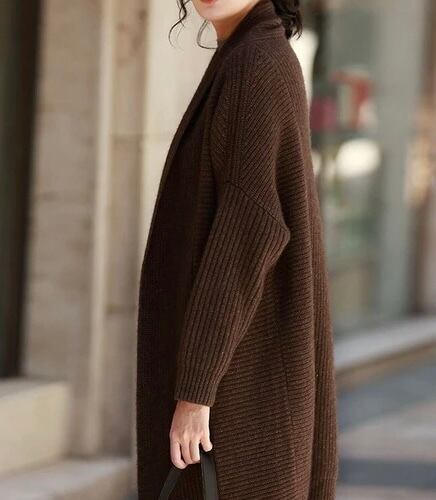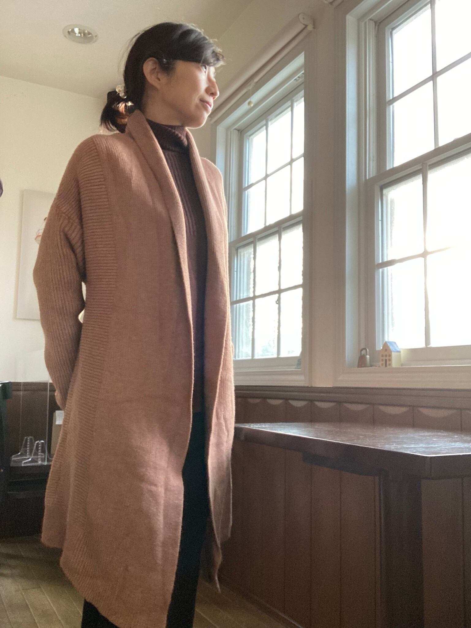 少しもっちり、しっとりした質感が肌あたりの良いやや厚手のニットロングカーディガン。