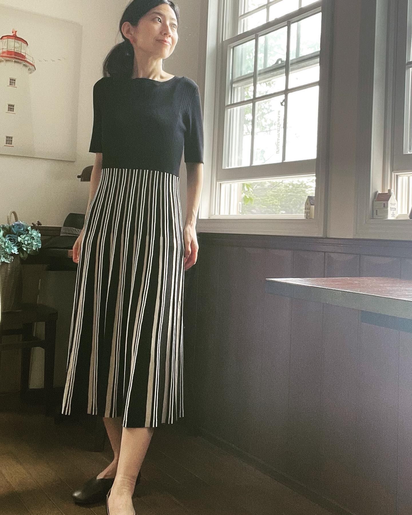 コンパクトなリブニットのトップスからつながるストライプ柄のジャガードスカートの流れが美しいワンピース。