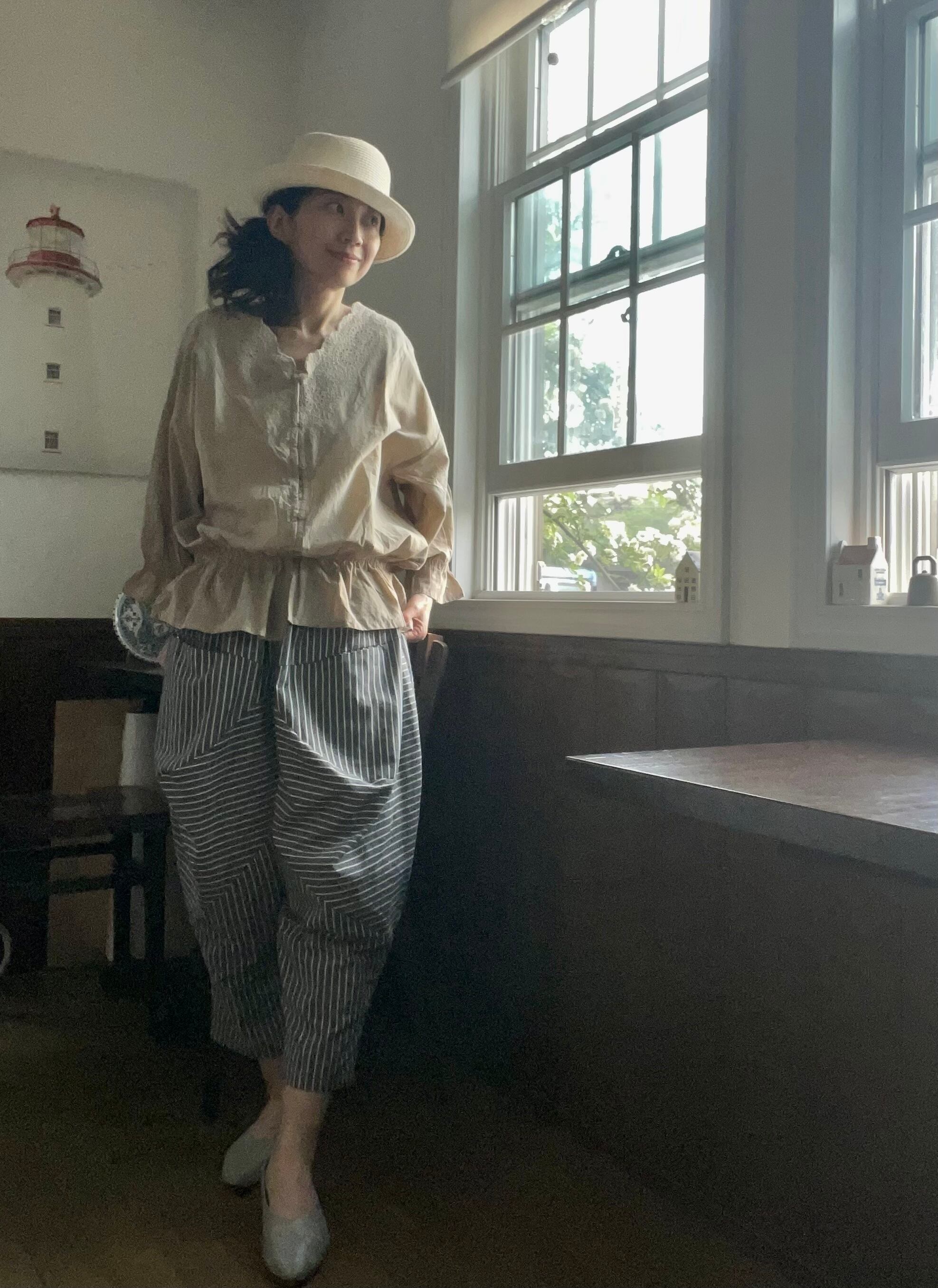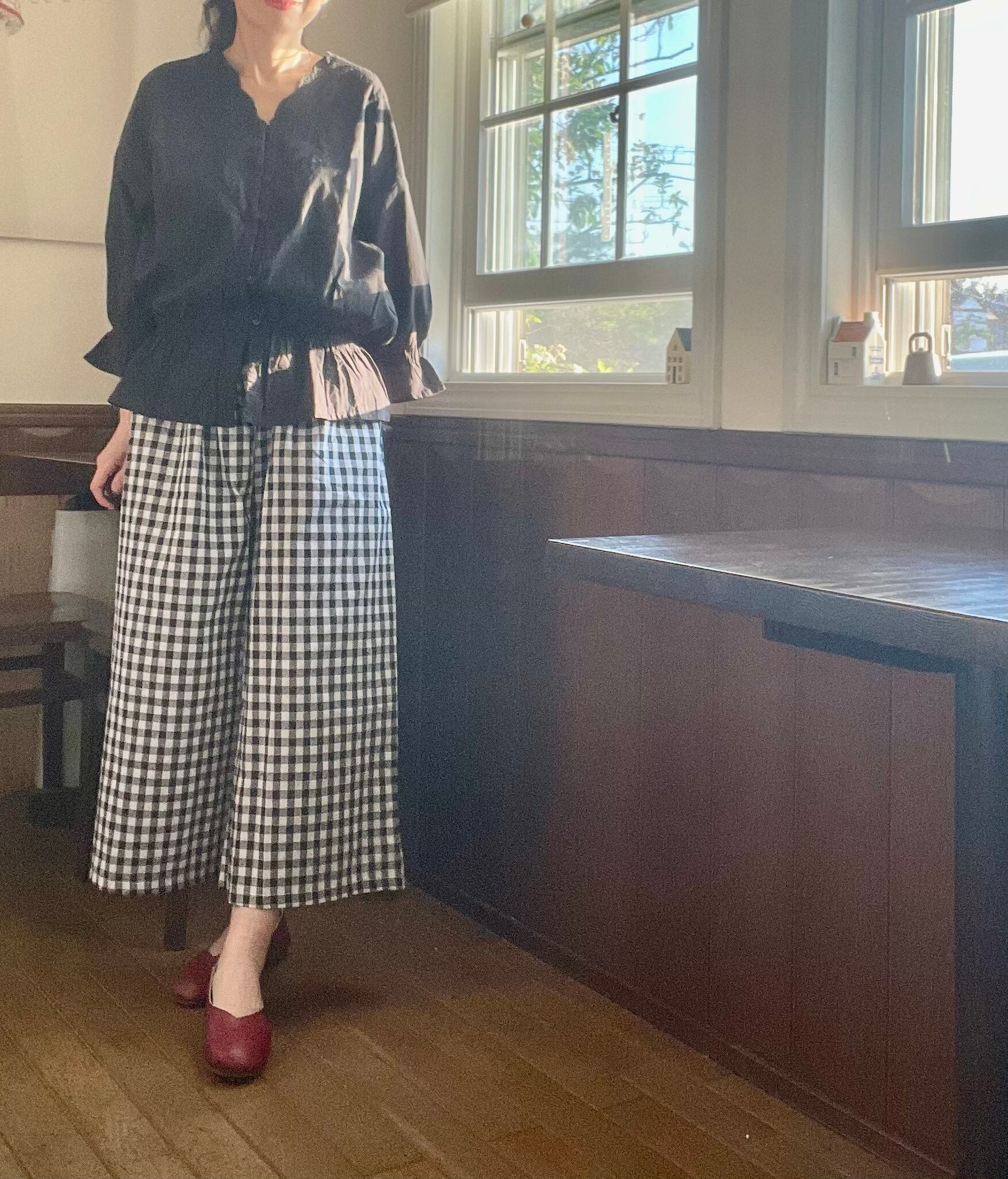 ゆったりしたサイズ感を、ウエストにゴムを入れることでメリハリあるシルエットに仕上げています。