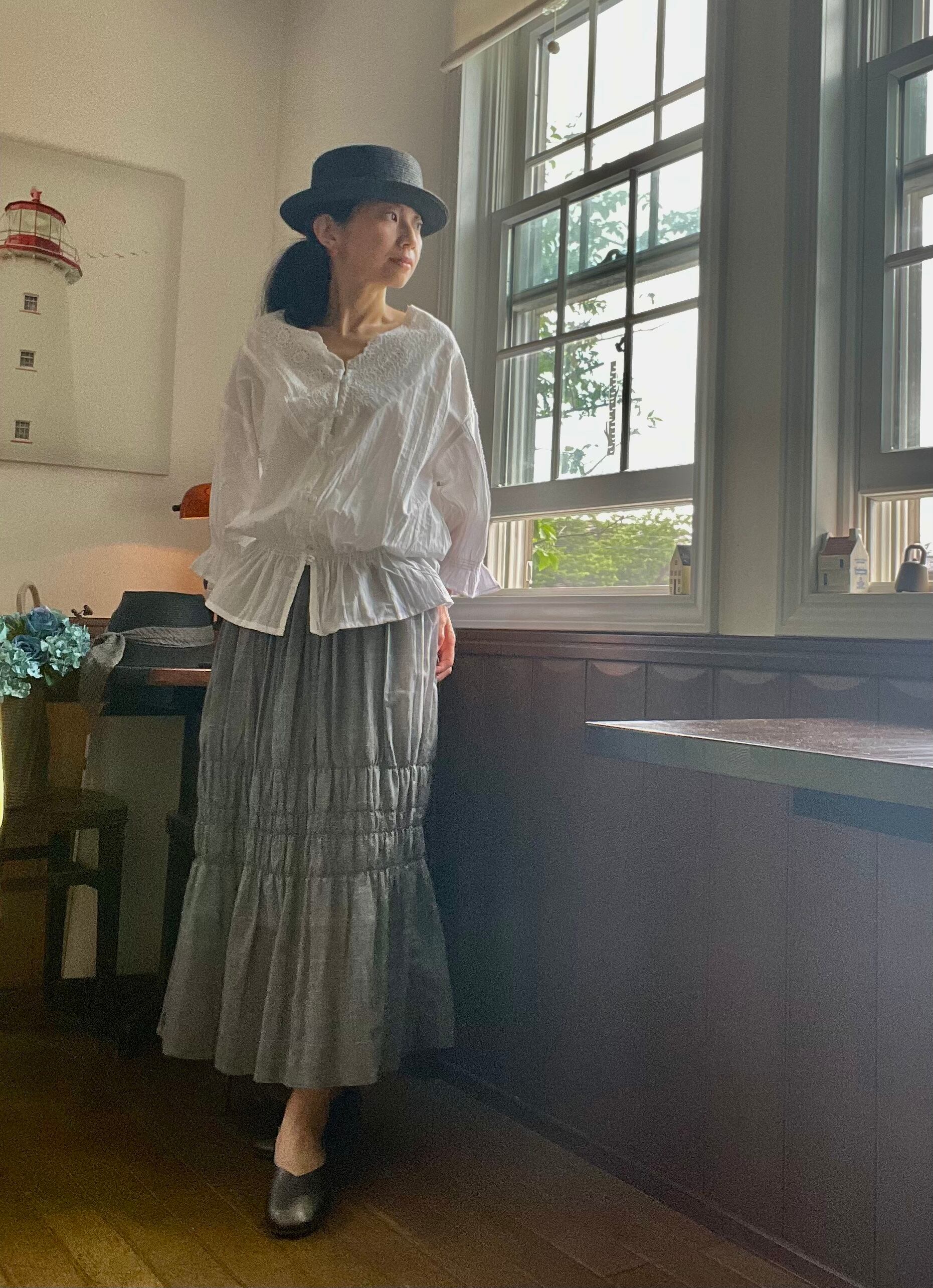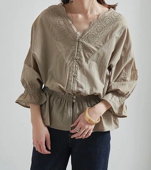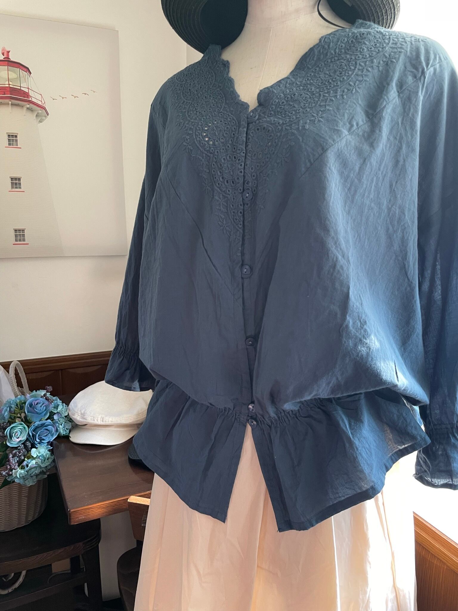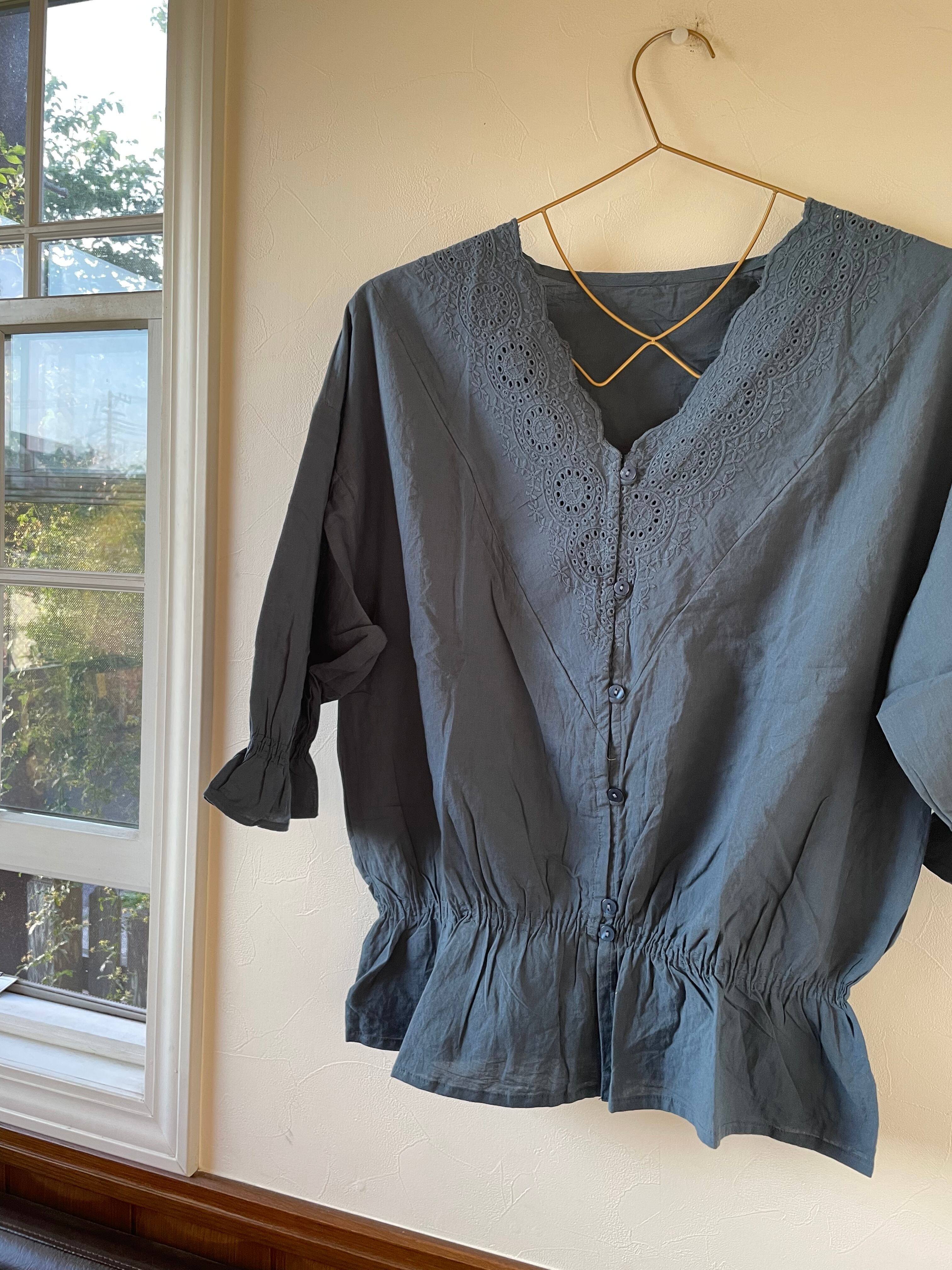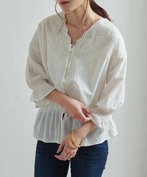 スカラップレースが華やかに飾る襟元をすっきりVネックで甘くなりすぎず、涼やかな大人の雰囲気に。綿キャンブリック地でさらりと肌触り良く、程よい薄さと軽さが蒸し暑い季節にもぴったり。