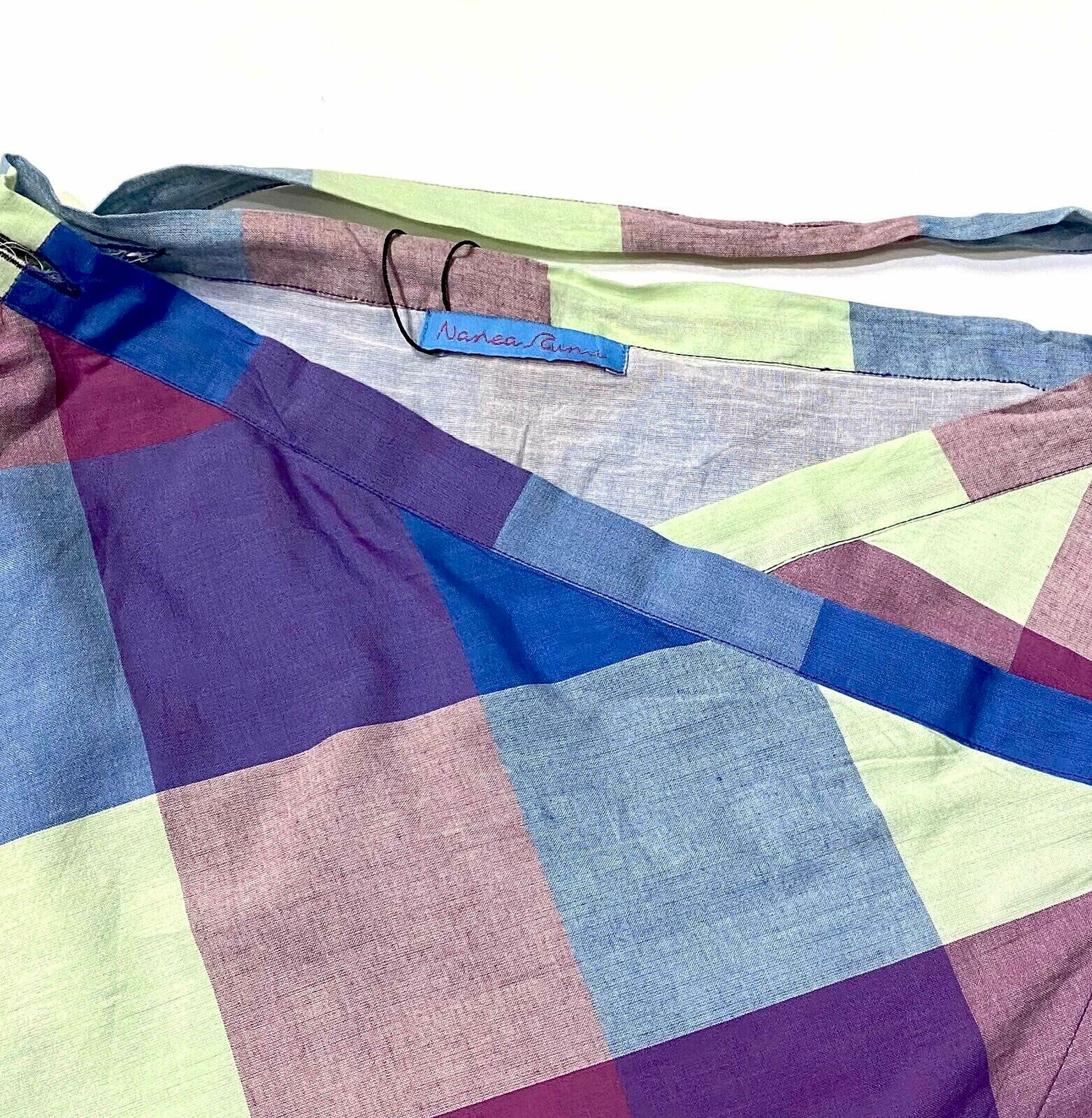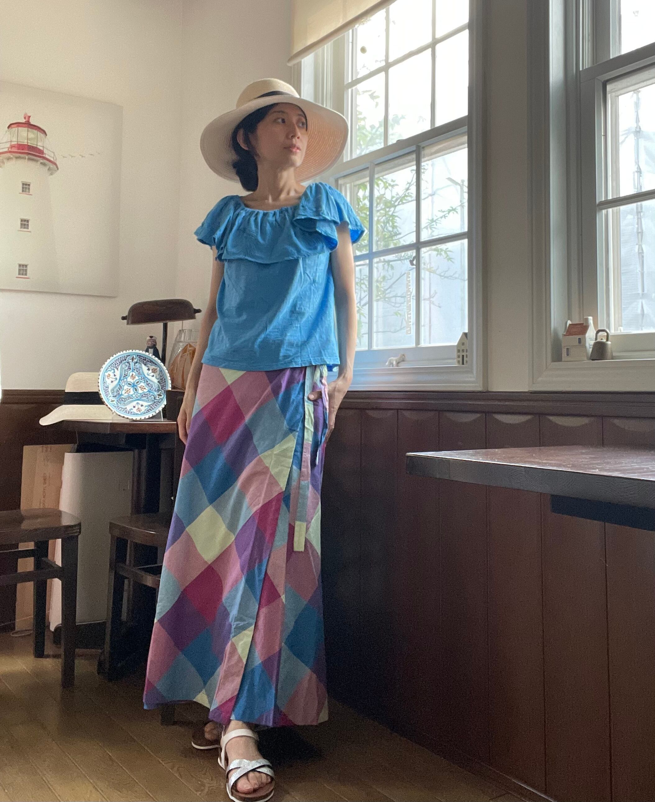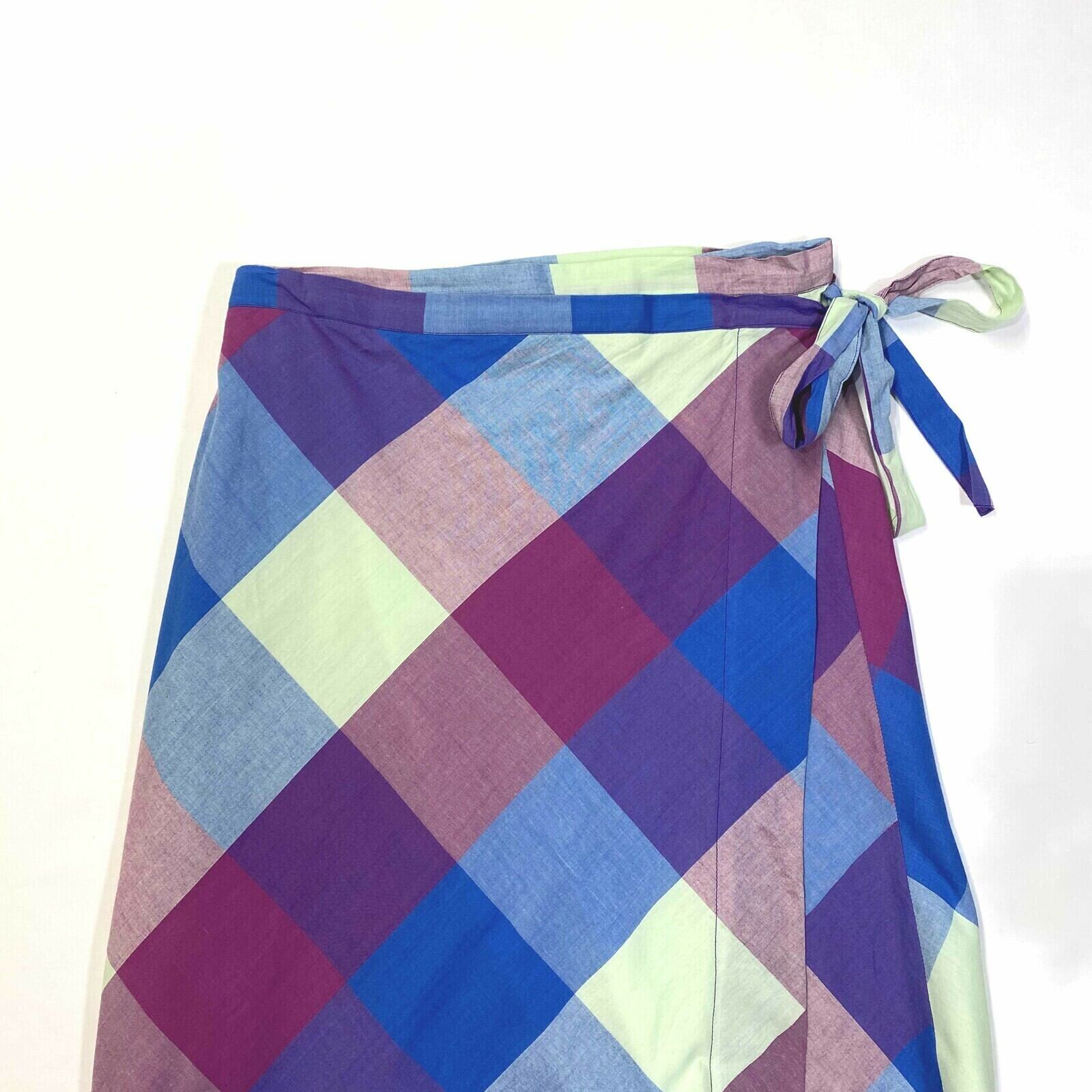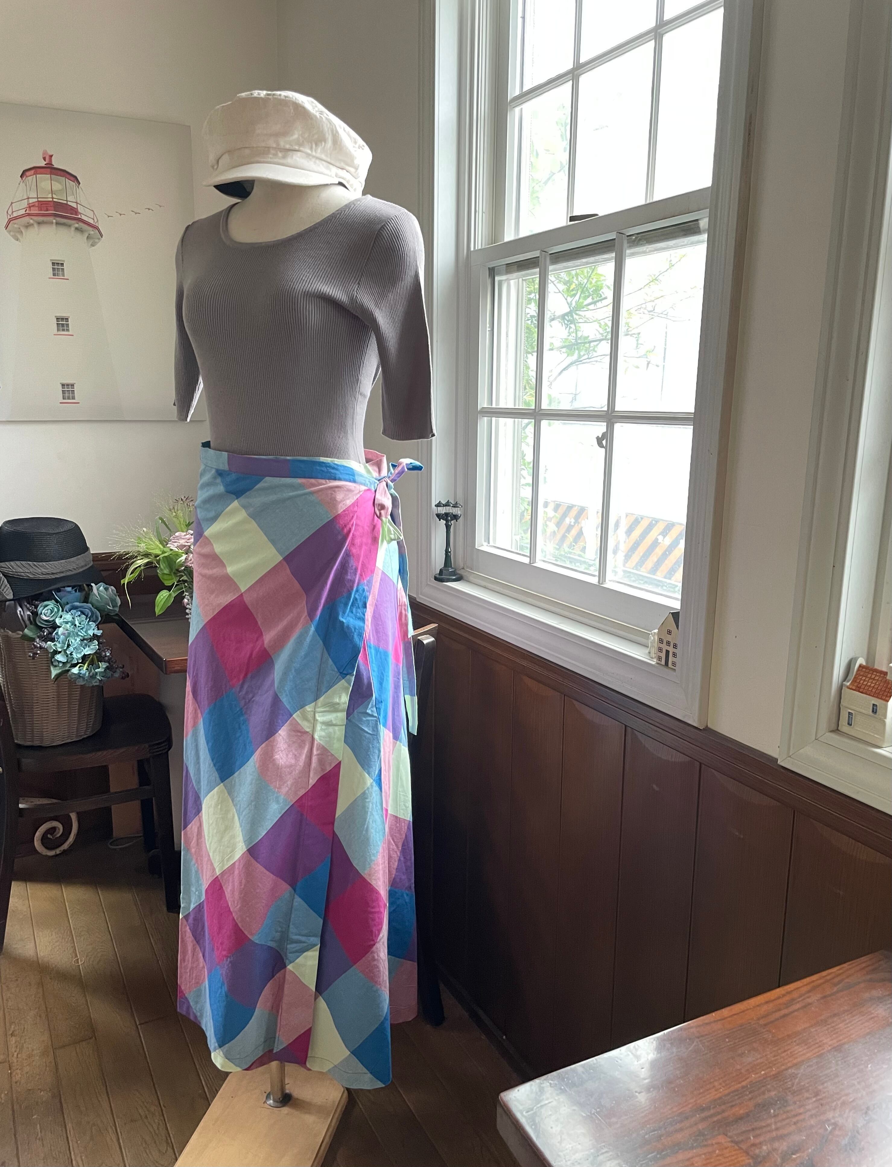マドラスチェックのような明るく爽やかな大柄チェックがハッピーな印象のラップスカート。薄手の風通しの良いコットン生地で汗をかいてもべたつかず暑い季節も快適に着ていただけます。ウエストリボンで結んで様々な体型の方に。安心な裏地付きです。