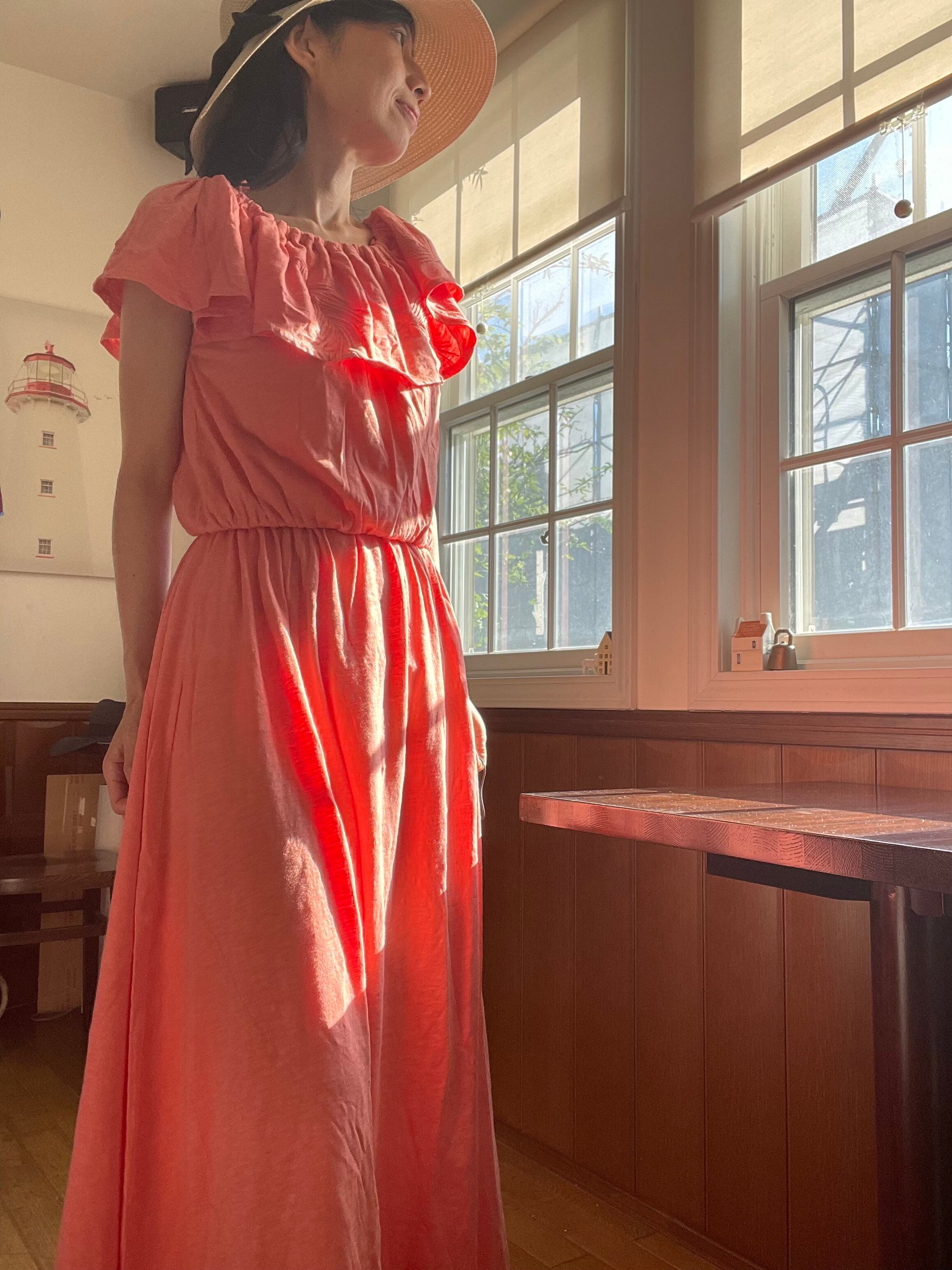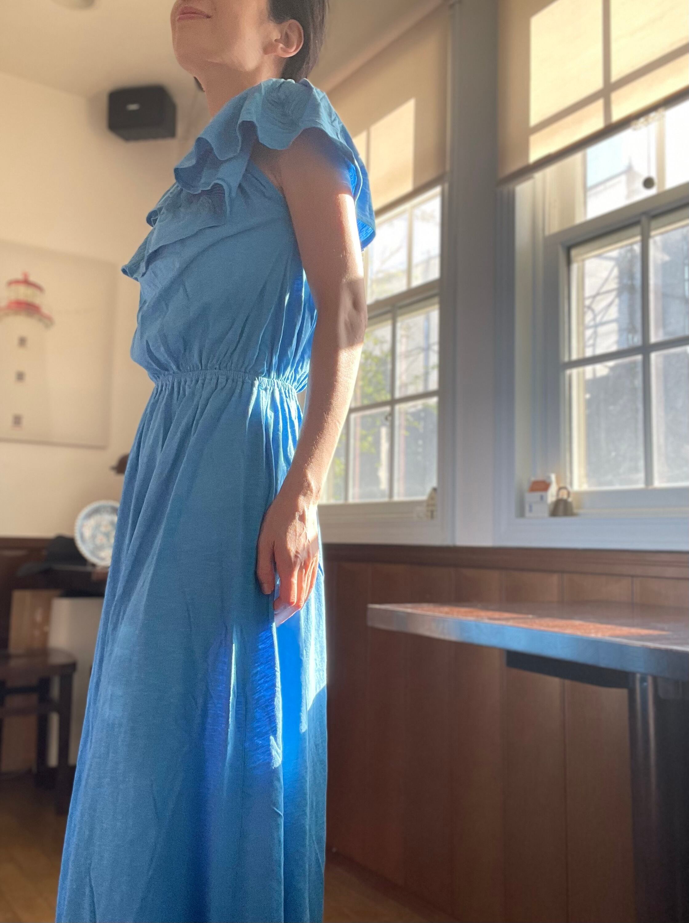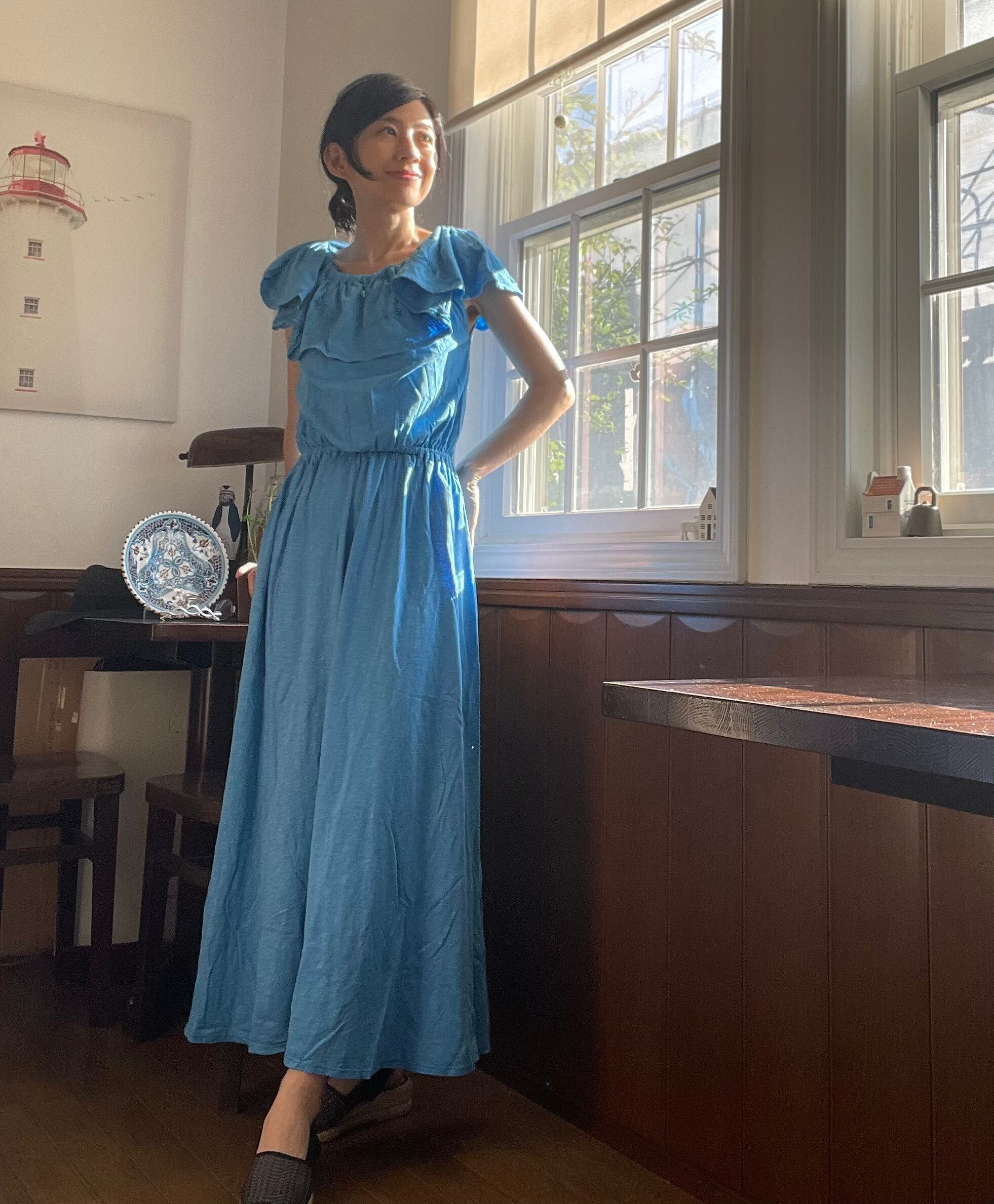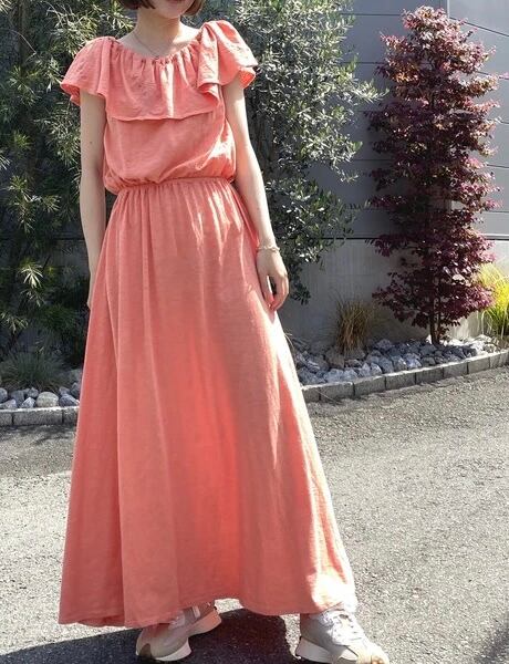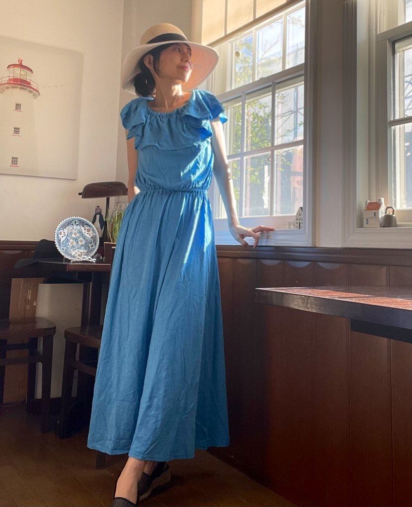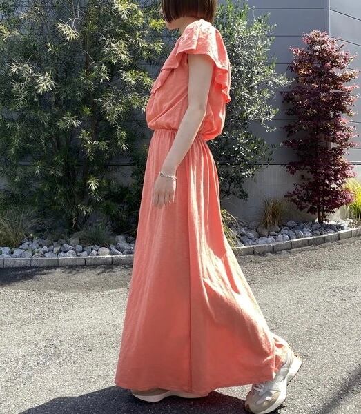 透け感もなく、べたつかないので一枚で涼しく快適。フリルデザインは二の腕もカバーしてくれて、ウエストのゴムでスタイルアップ効果も。