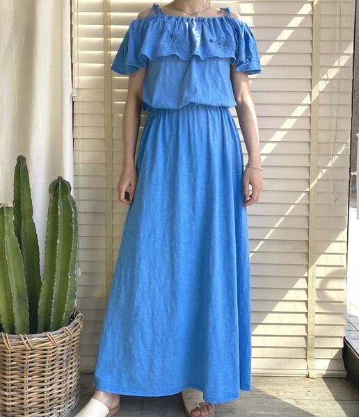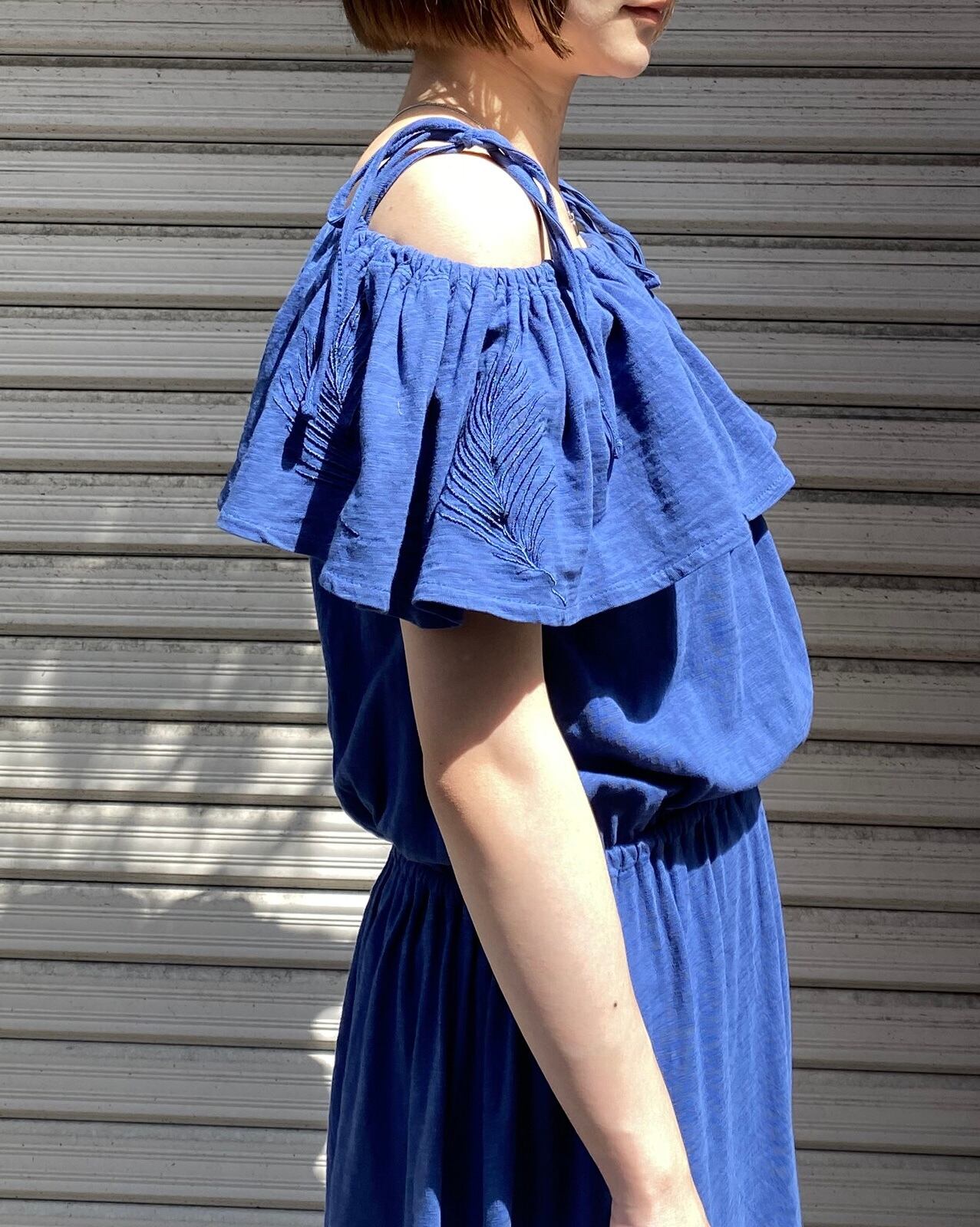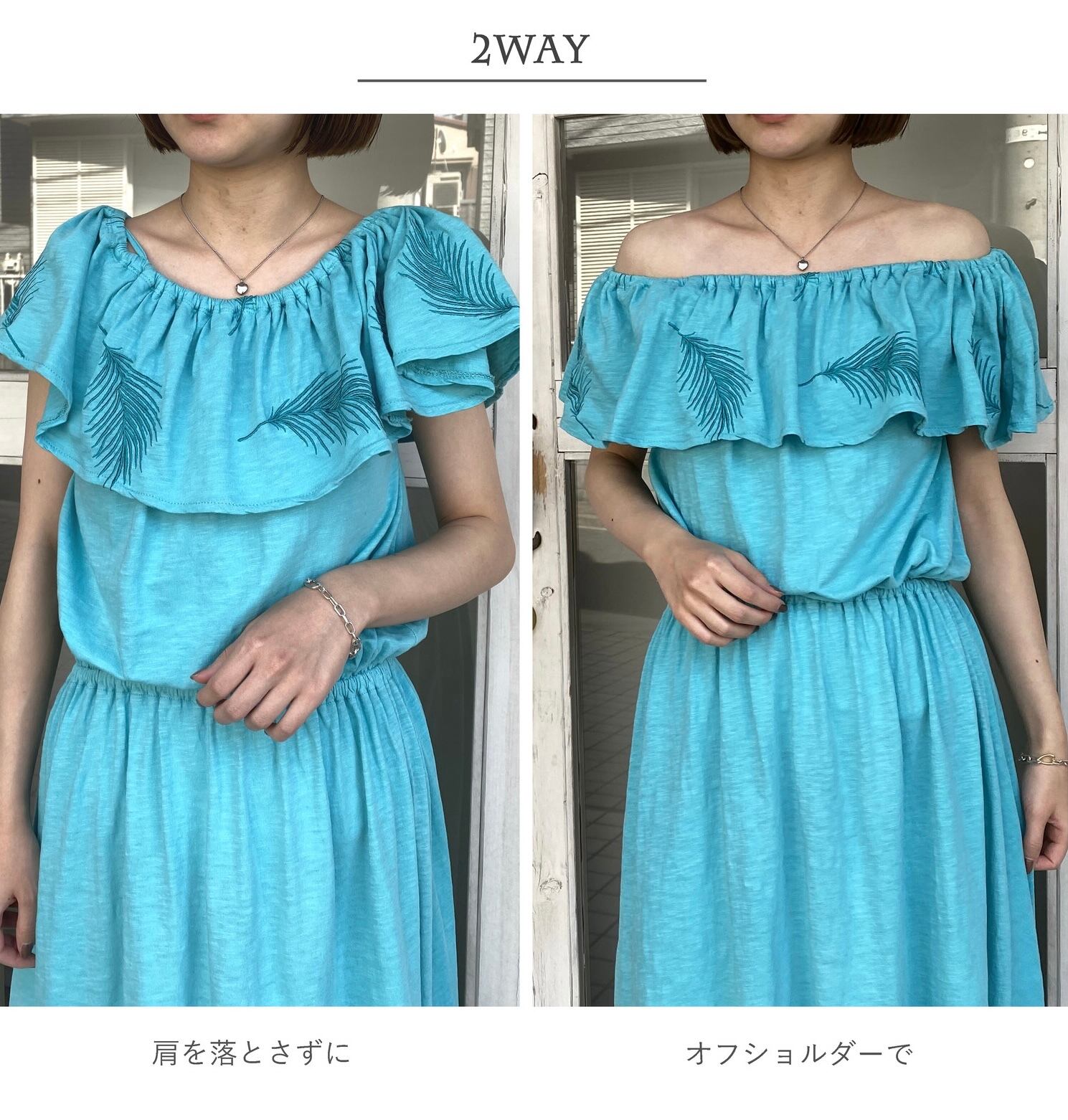 肌触りよい風合いのコットンをたっぷり使用したワンピース。ビーチに映える色み、2wayで着れるオフショルダー、さりげないリーフ刺繍もリゾートにぴったり。伸縮性のある生地でリラックスして着ていただけます。