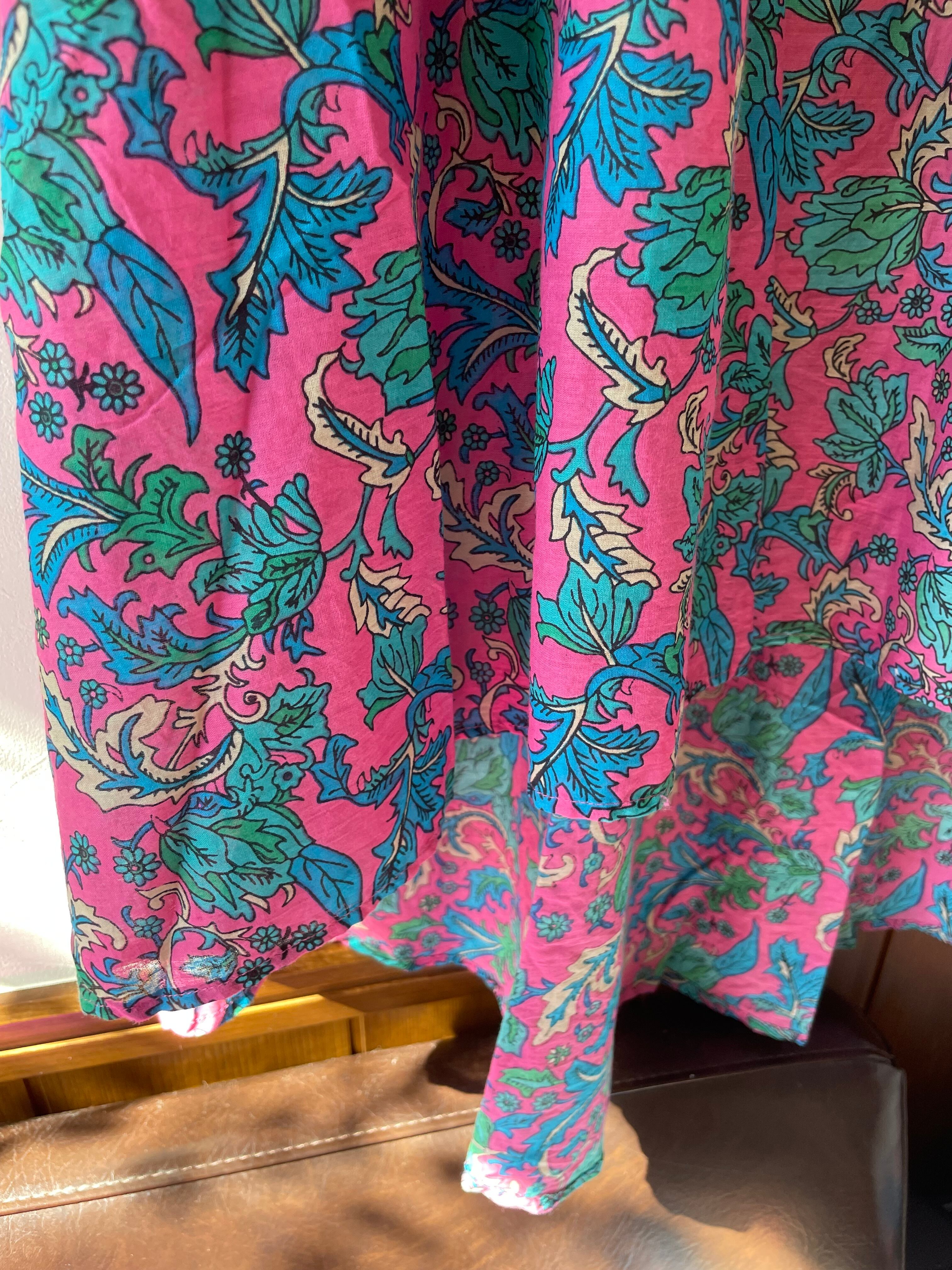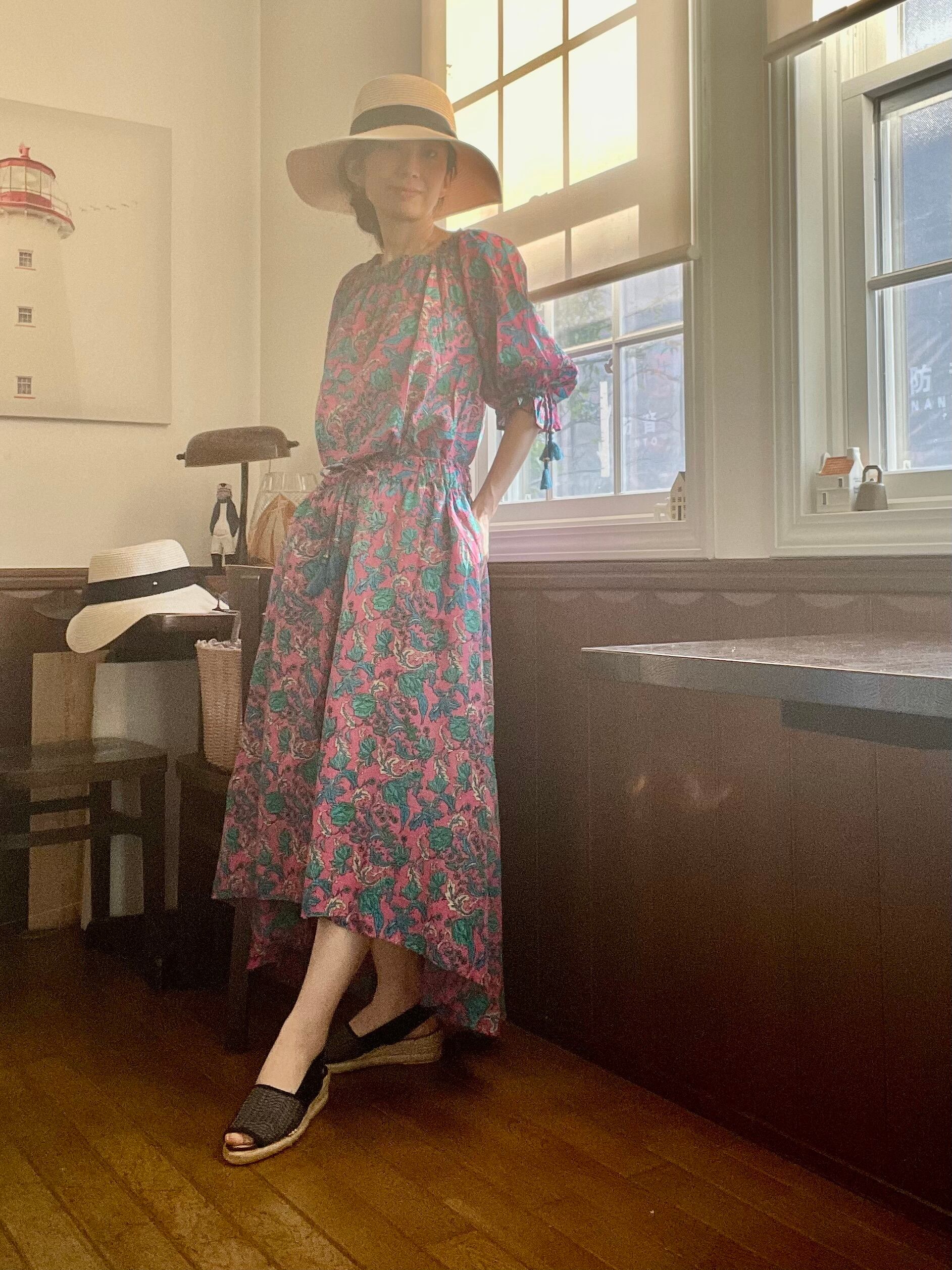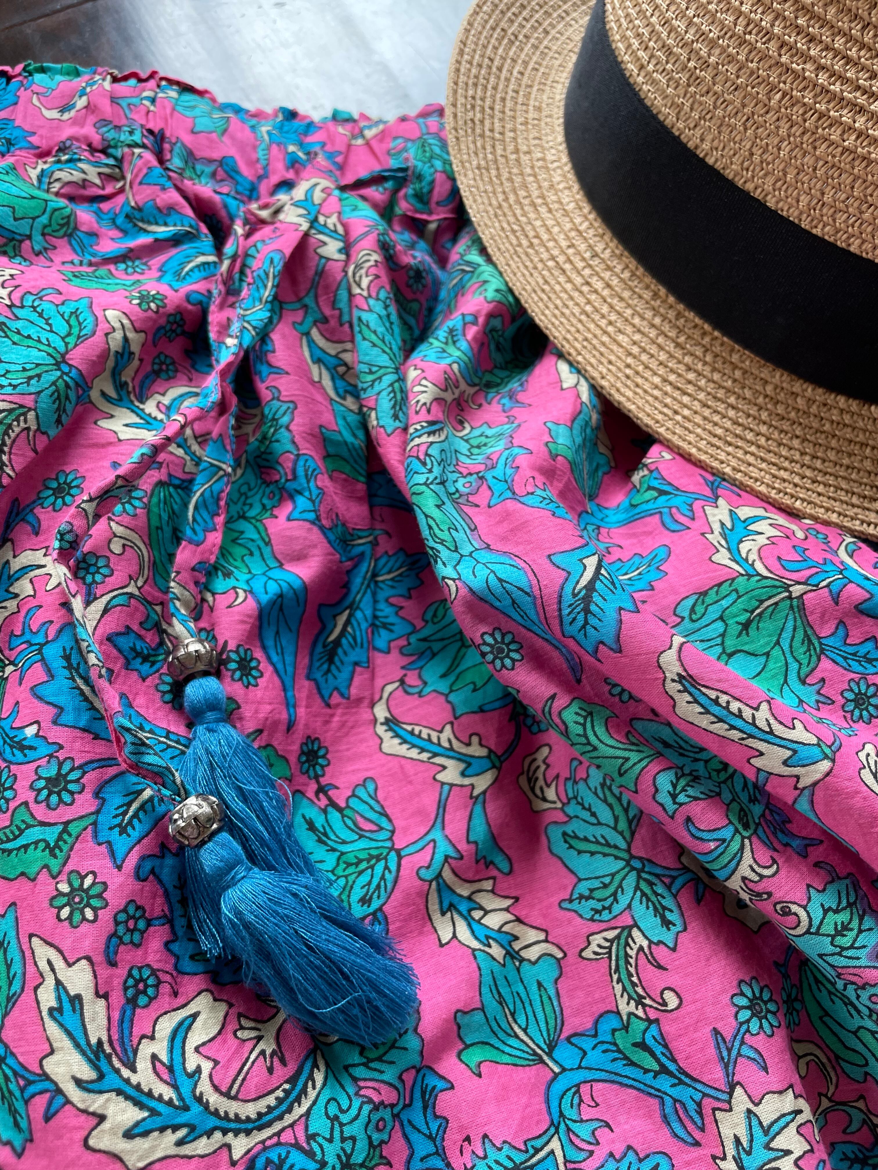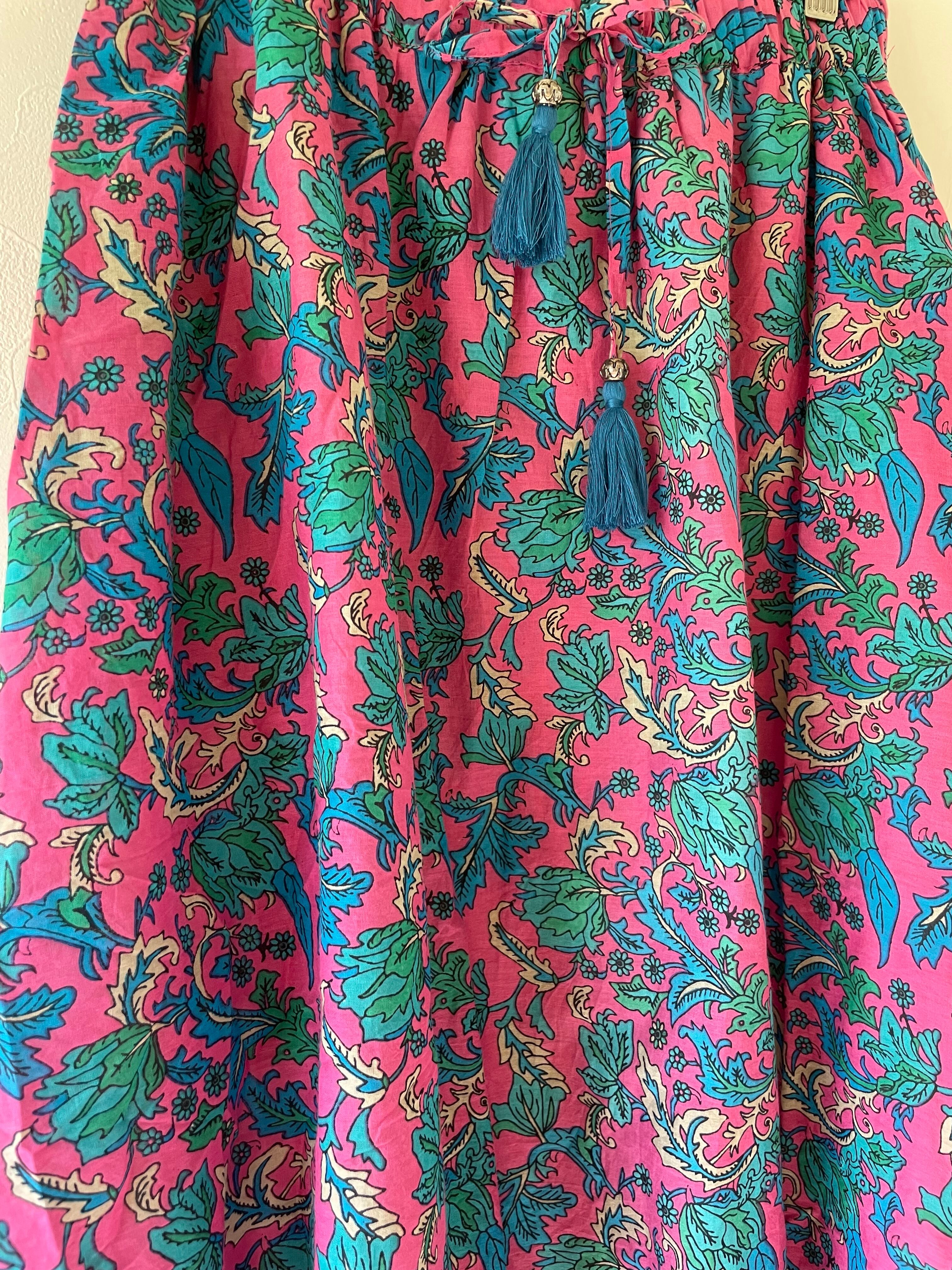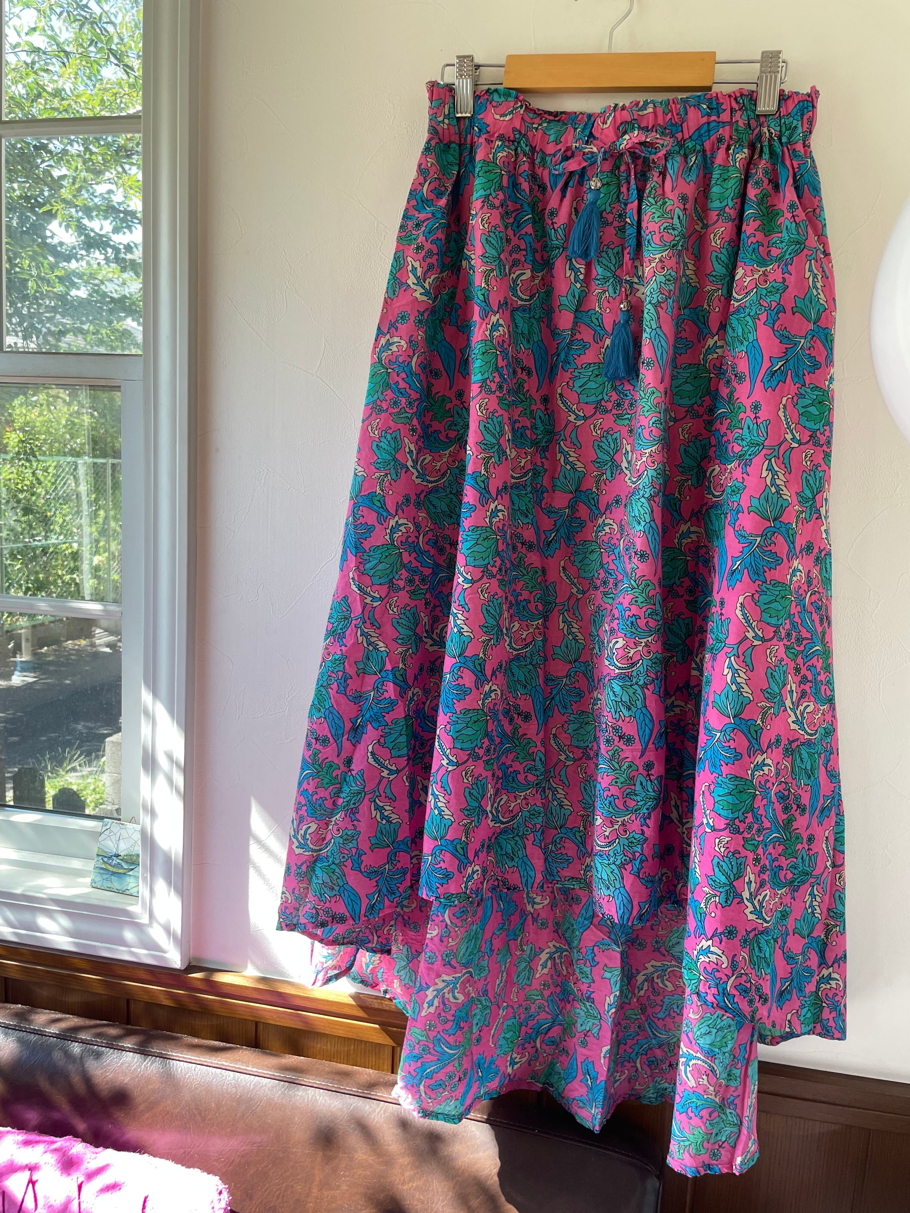 ウエスト部分のリボンにはフリンジのチャーム付きでエスニックな雰囲気。薄手のインド綿が軽やかで暑い日にも涼しく、裏地付きなのも安心です。