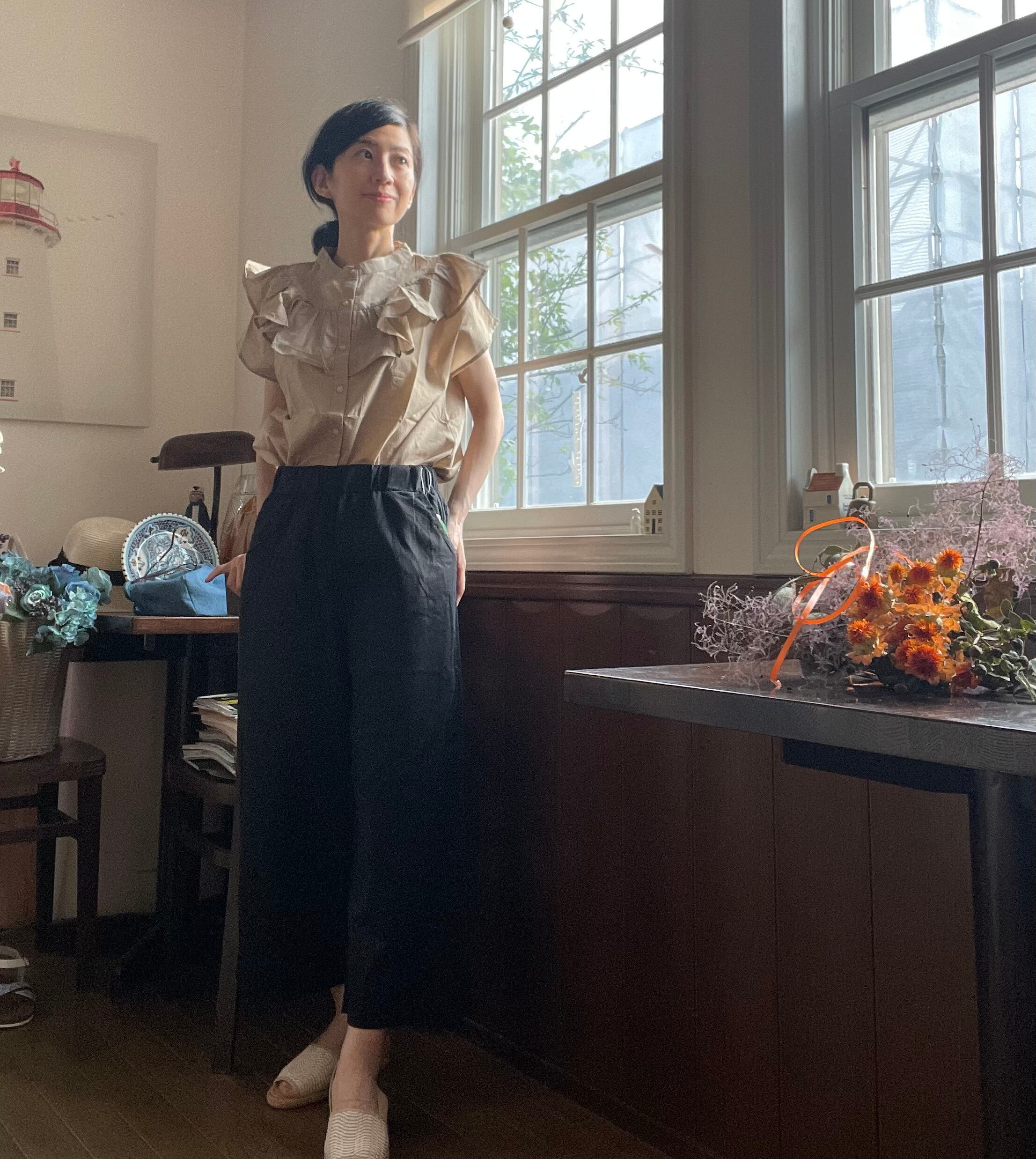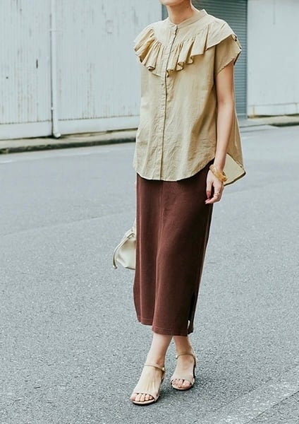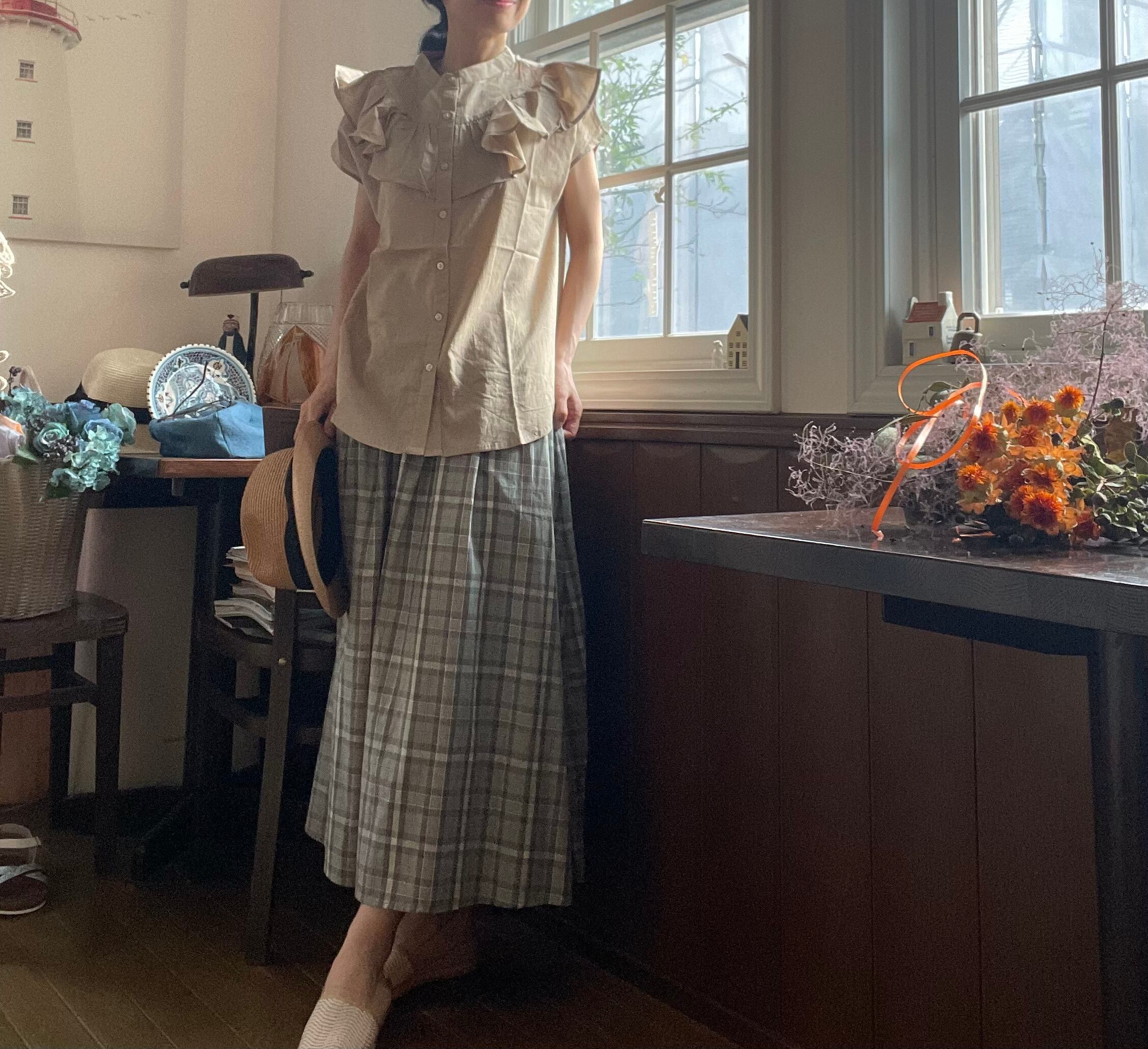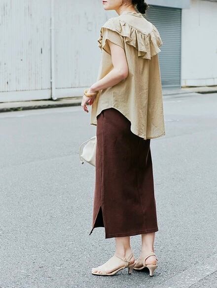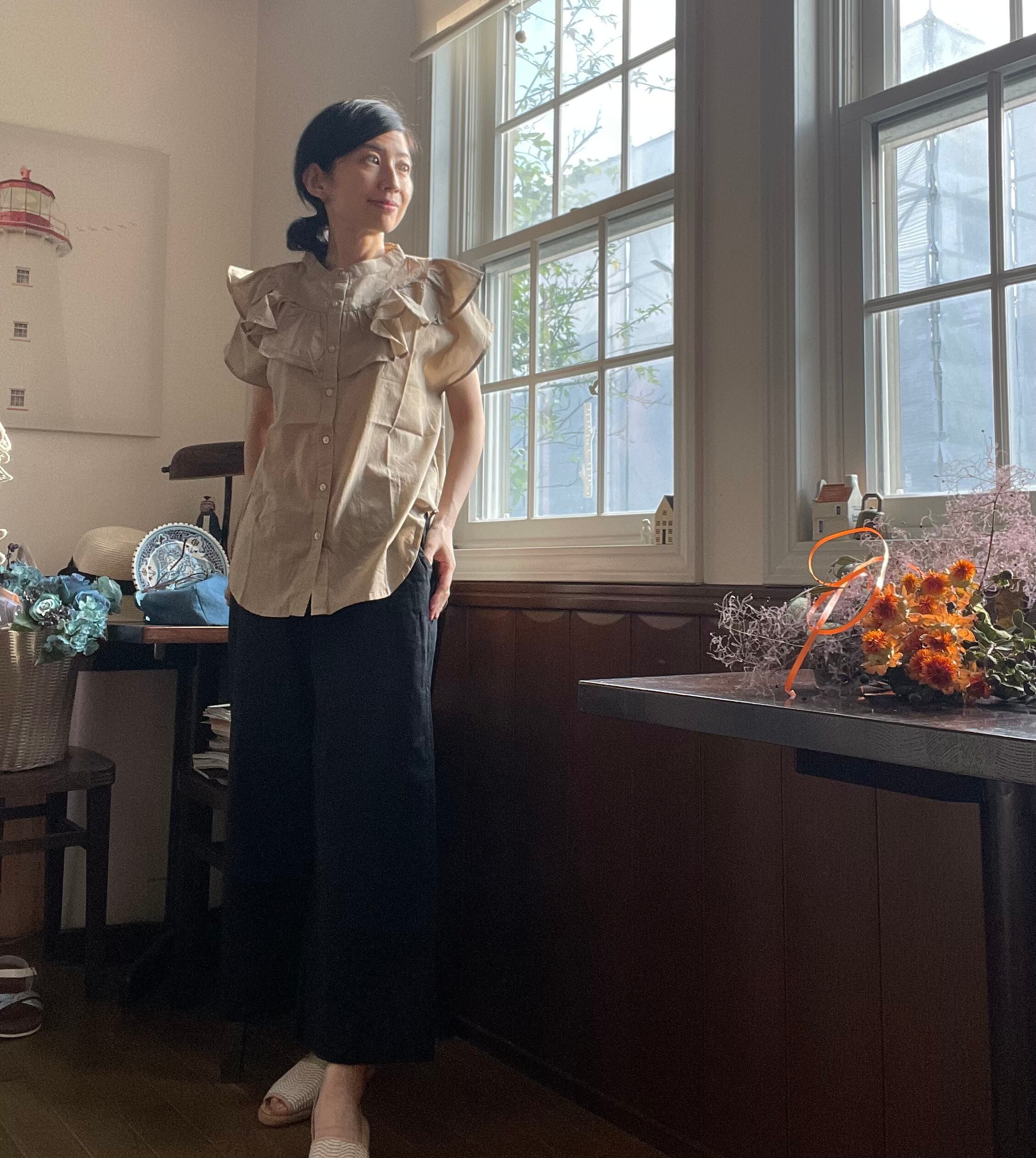 胸元のフリルがほどよくフェミニンな大人ブラウス。バンドカラーで甘くなりすぎず、メリハリあるシルエットに。裾は前後差のあるラウンドヘムで、ボトムインもアウトも。