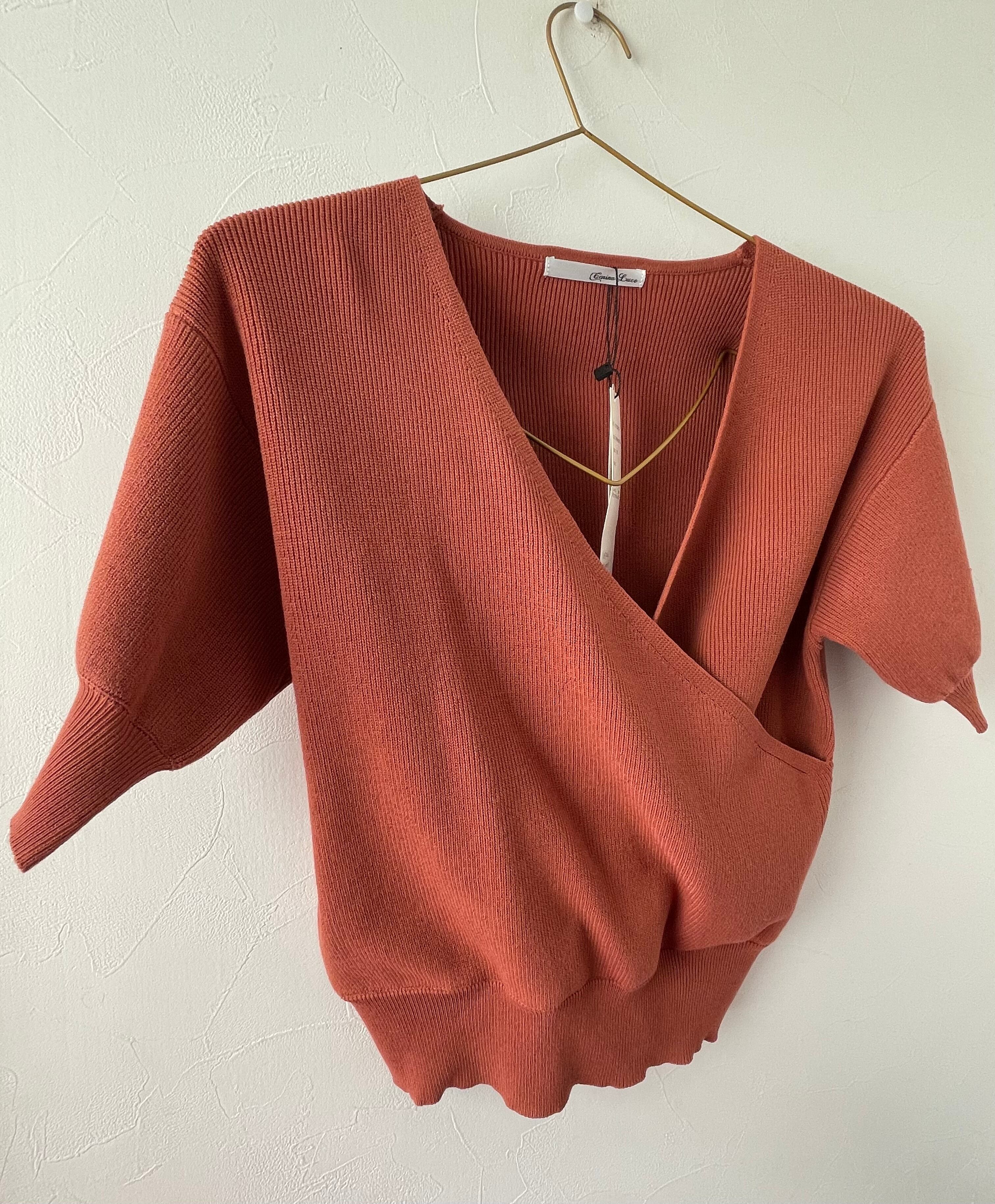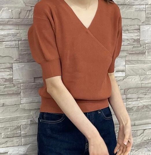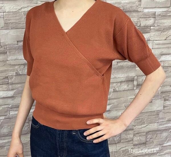 程よい深さのカシュクールが首周りをすっきりみせてくれるプルオーバーニットトップス。一枚でフレンチシックな雰囲気を漂わせてくれます。