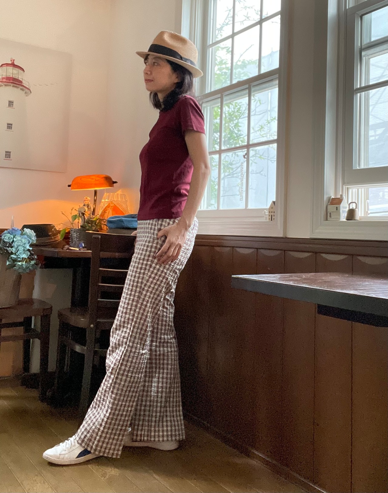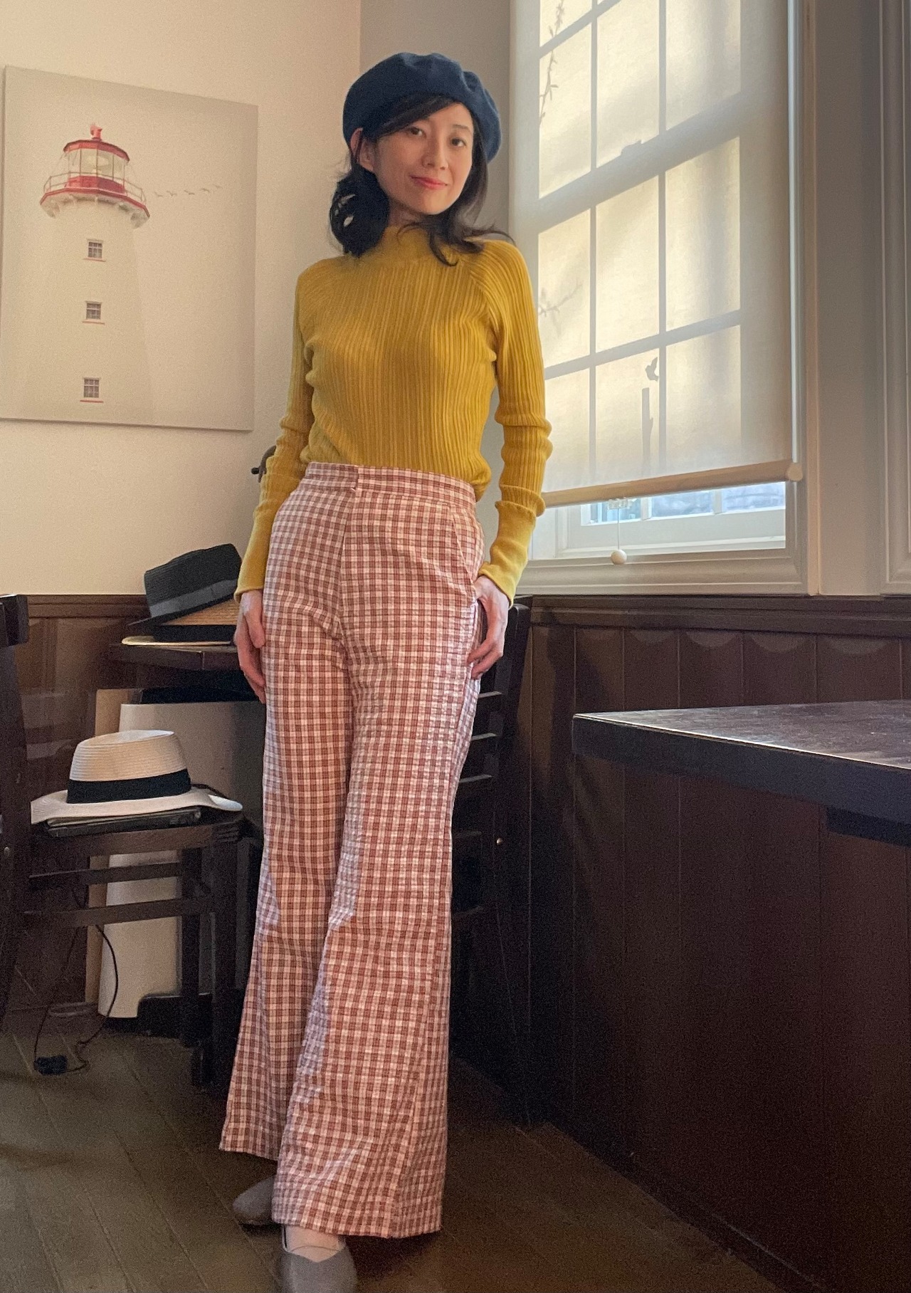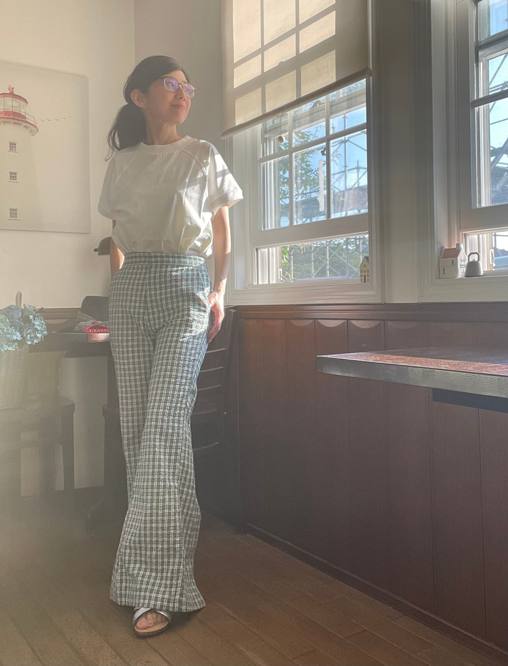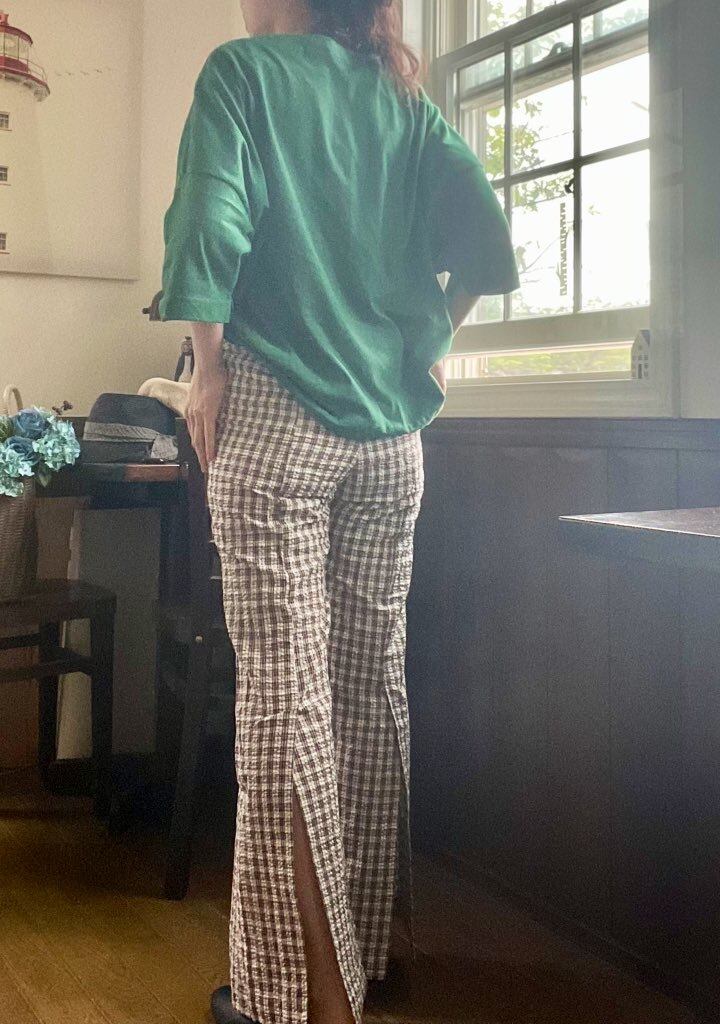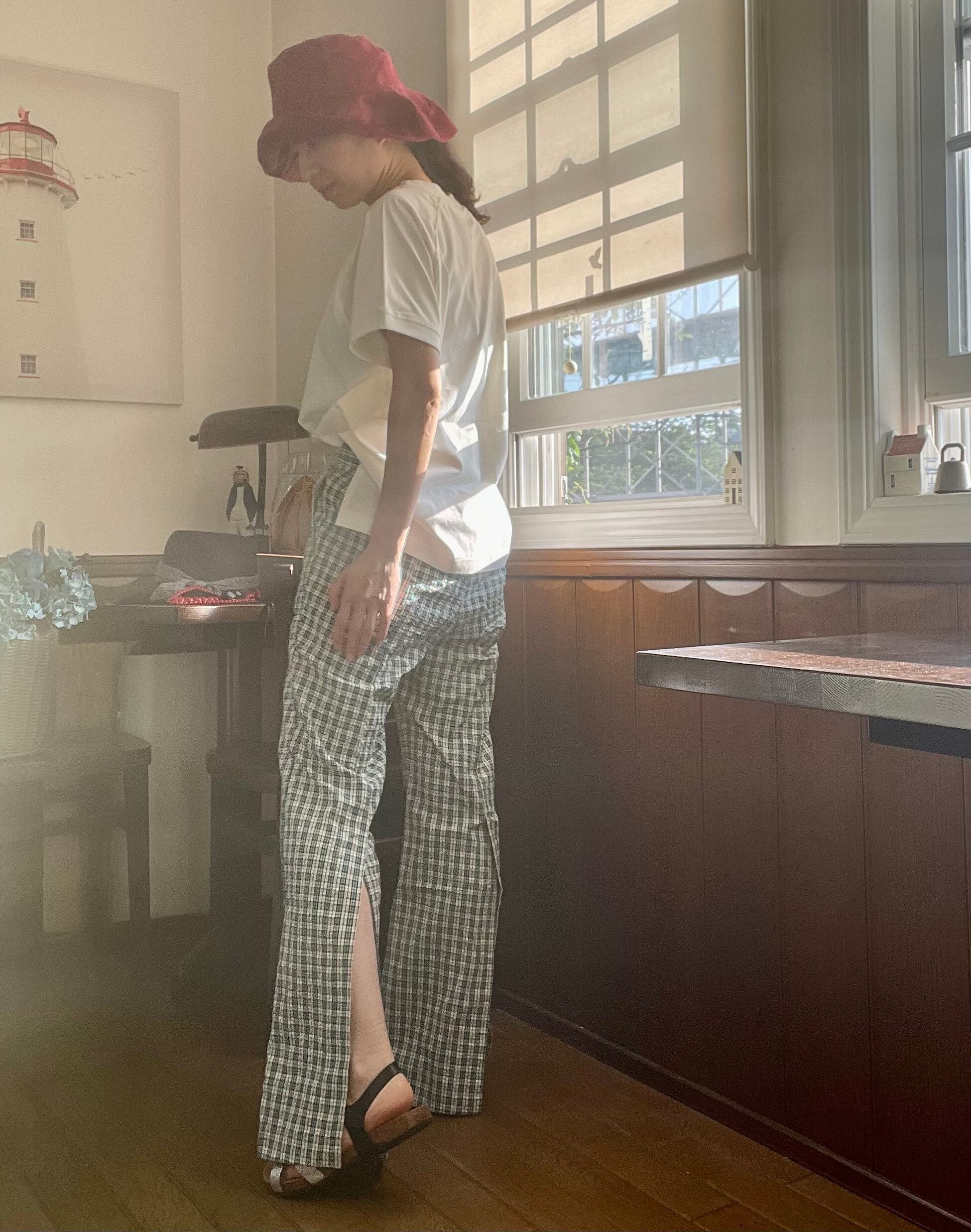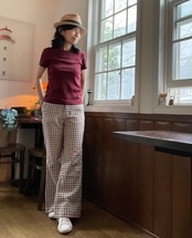 派手になりすぎない色味のチェック柄がどこかレトロでカジュアルなコーデにぴったり。